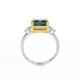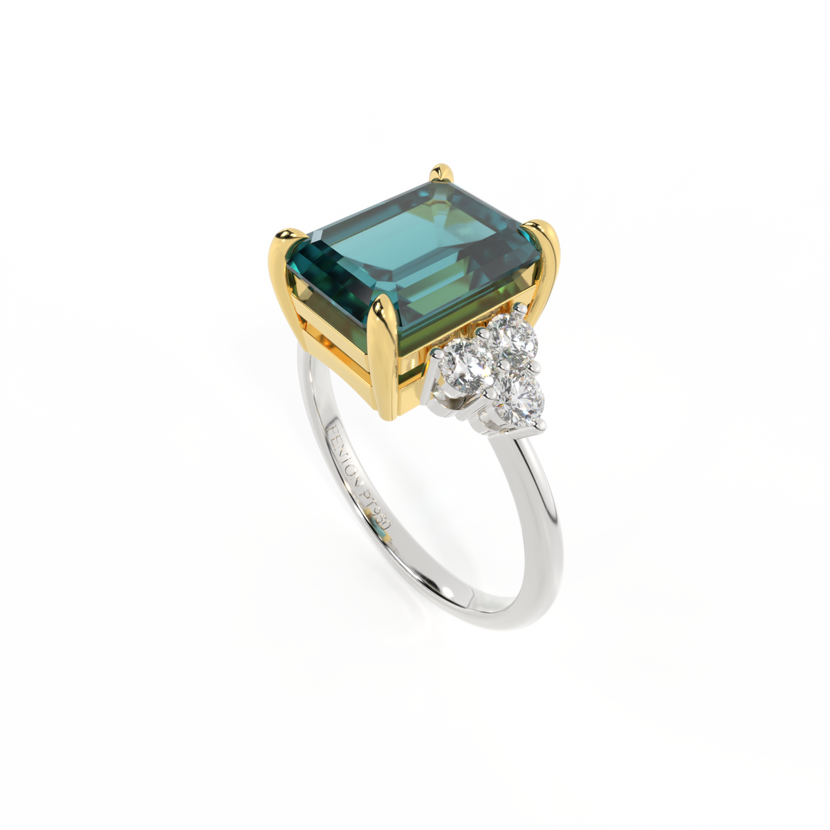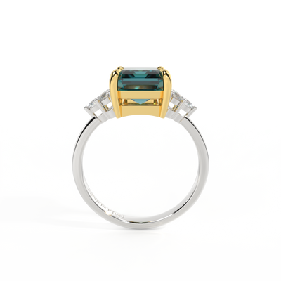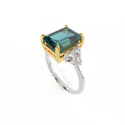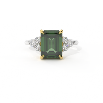 Your glistening Emerald cut Green Sapphire is framed on either side by a trefoil cluster of three 1.8mm round brilliant cut GH/VS diamonds, each securely held into place in a claw setting. The design draws the eye to the glistening Ruby center stone, sitting proudly in a classic open gallery setting crafted from solid, recycled 18K gold or platinum. The open setting of this design allows the light to reflect in all directions, creating a lustrous and sparkling look.