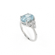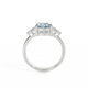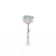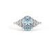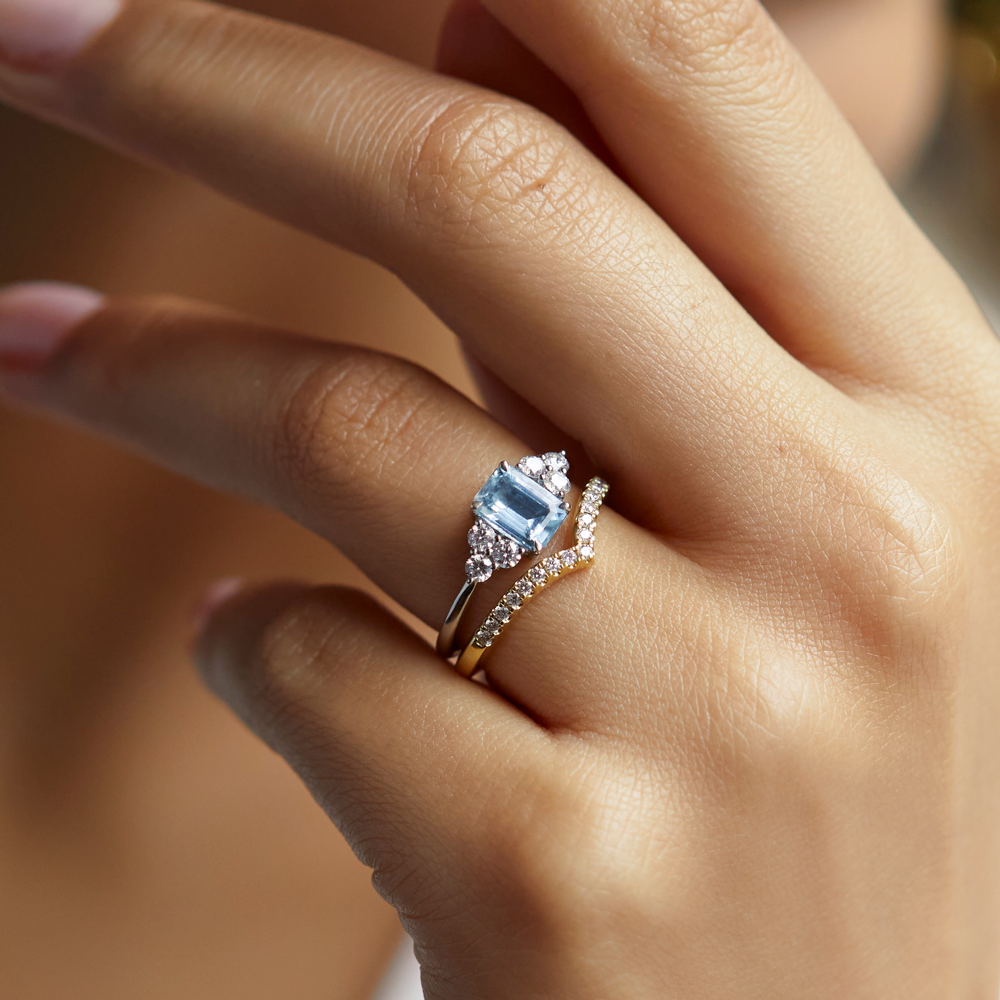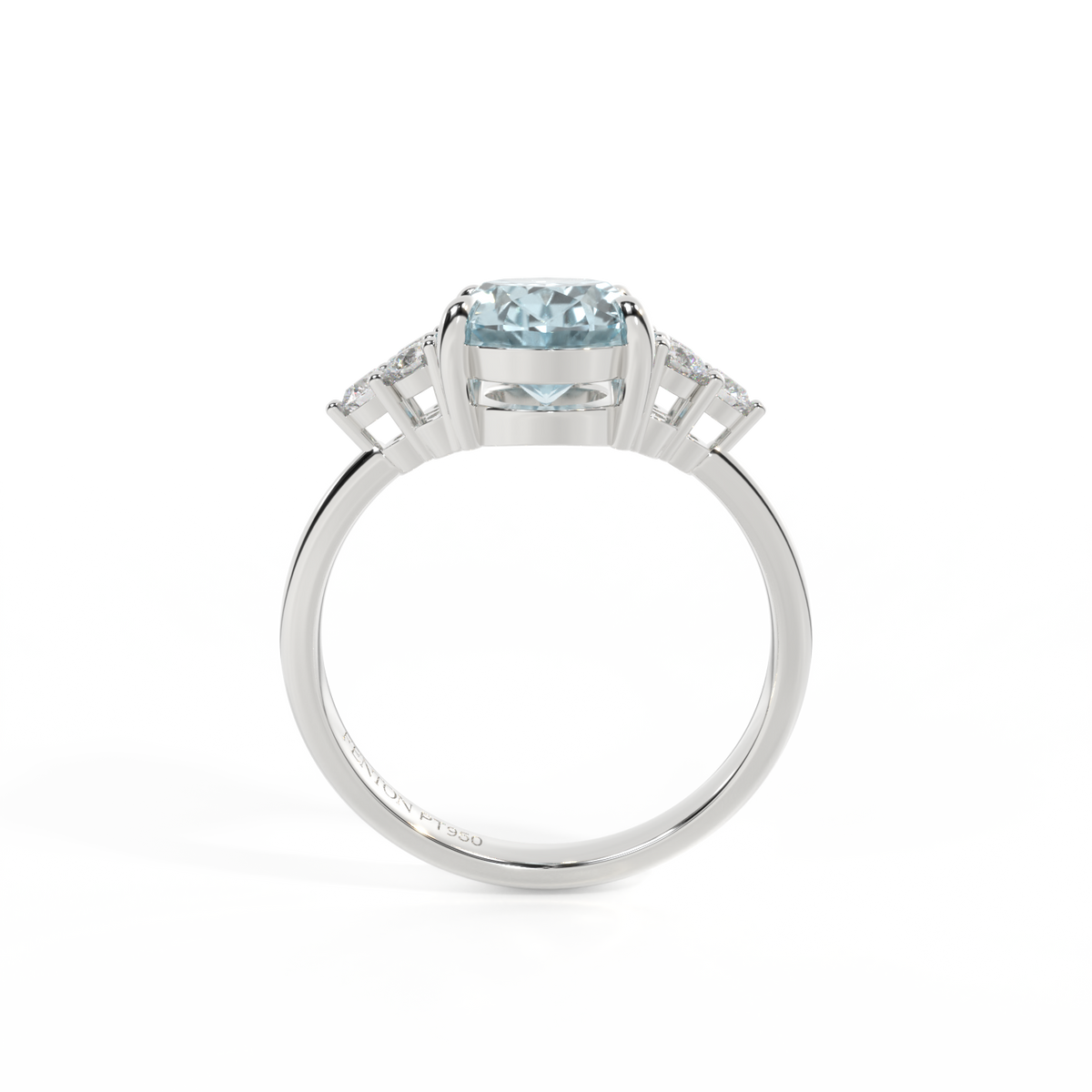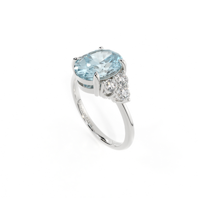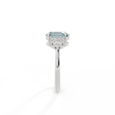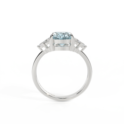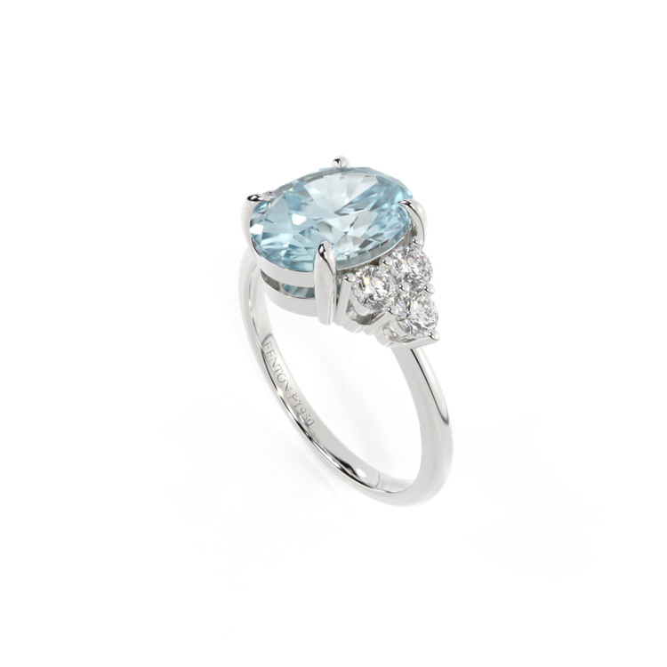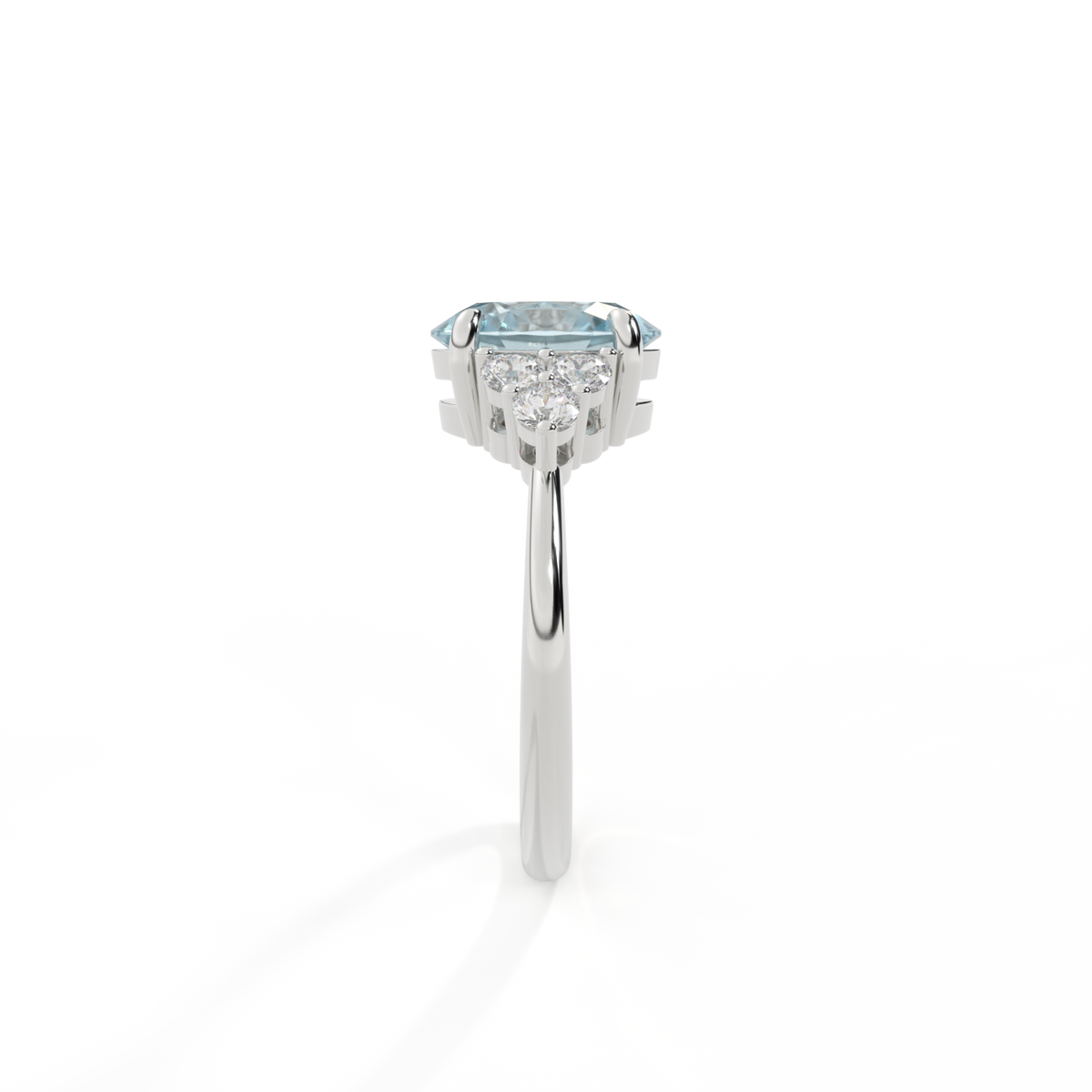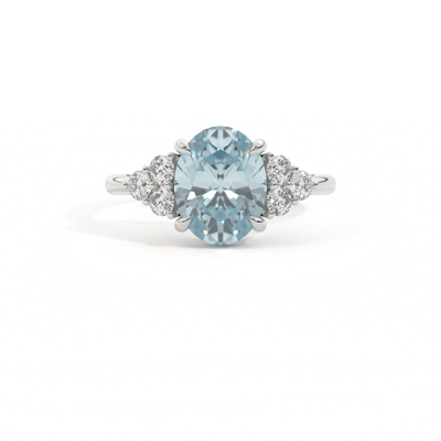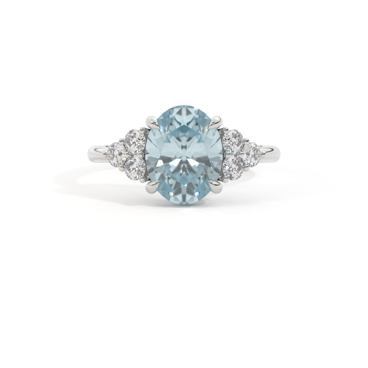 Your glistening Oval cut Aquamarine is framed on either side by a trefoil cluster of three 1.8mm round brilliant cut GH/VS diamonds, each securely held into place in a claw setting. The design draws the eye to the glistening Aquamarine center stone, sitting proudly in a classic open gallery setting crafted from solid, recycled 18K gold or platinum. The open setting of this design allows the light to reflect in all directions, creating a lustrous and sparkling look.