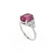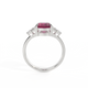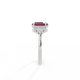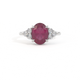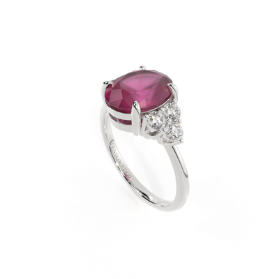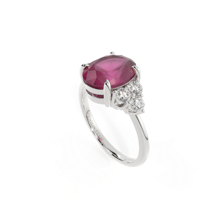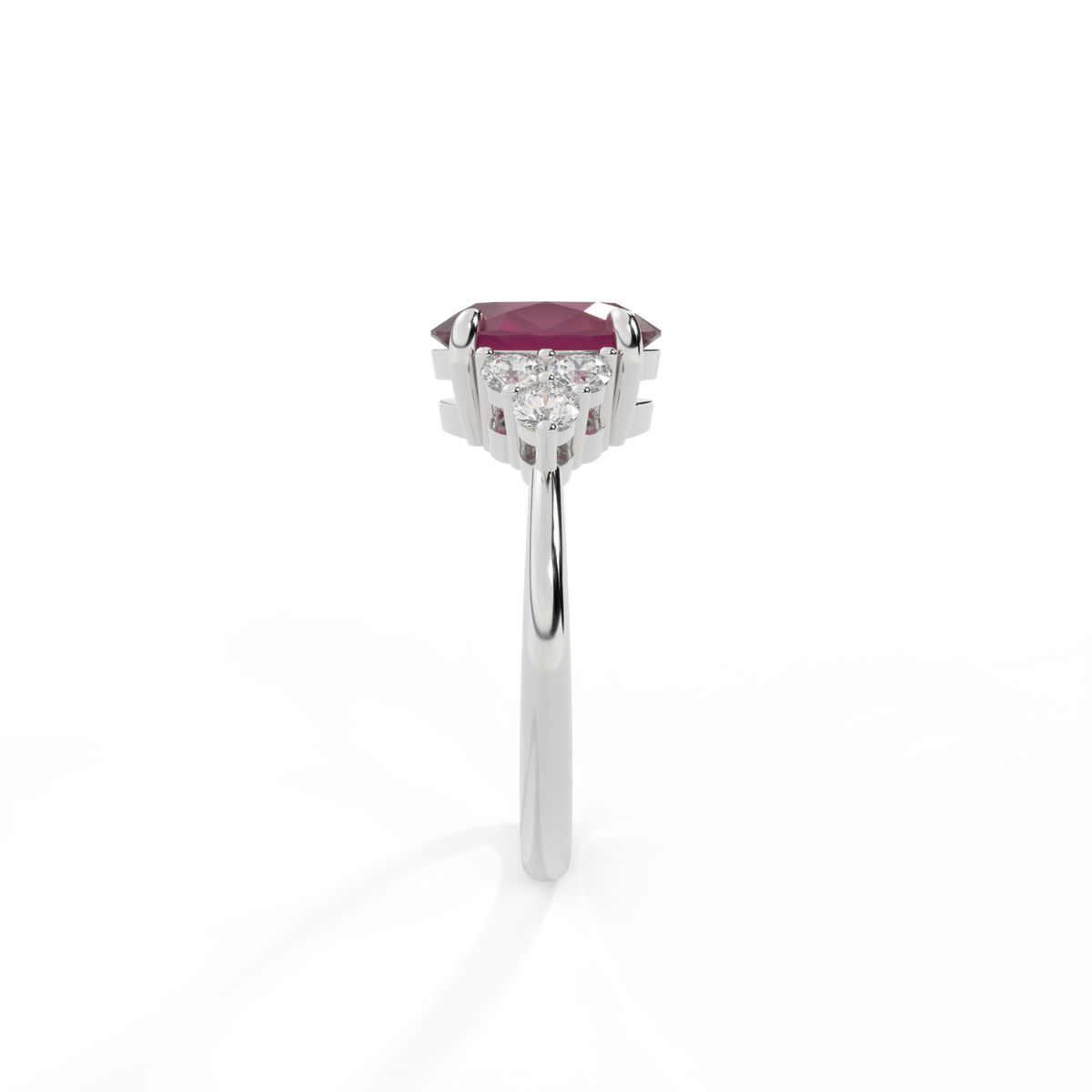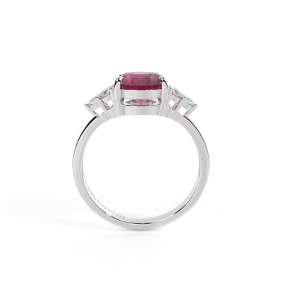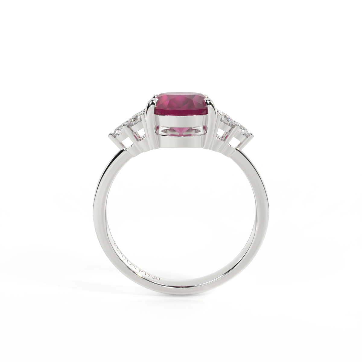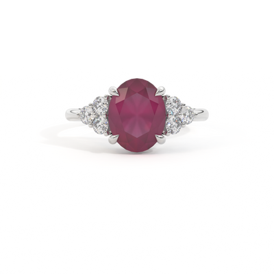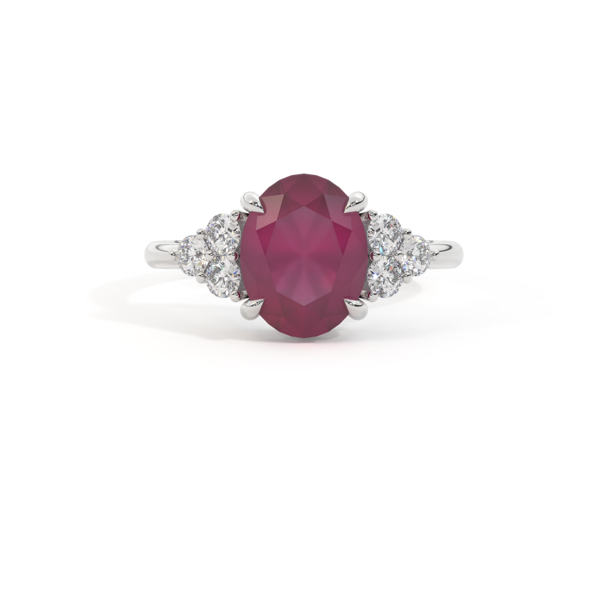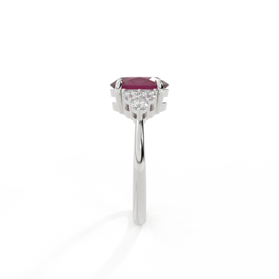 Your glistening Oval cut Ruby is framed on either side by a trefoil cluster of three 1.8mm round brilliant cut GH/VS diamonds, each securely held into place in a claw setting. The design draws the eye to the glistening Ruby center stone, sitting proudly in a classic open gallery setting crafted from solid, recycled 18K gold or platinum. The open setting of this design allows the light to reflect in all directions, creating a lustrous and sparkling look.