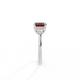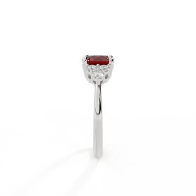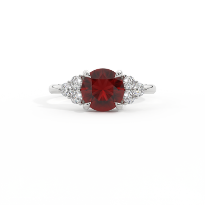 Your glistening Round cut Garnet is framed on either side by a trefoil cluster of three 1.8mm round brilliant cut GH/VS diamonds, each securely held into place in a claw setting. The design draws the eye to the glistening Garnet center stone, sitting proudly in a classic open gallery setting crafted from solid, recycled 18K gold or platinum. The open setting of this design allows the light to reflect in all directions, creating a lustrous and sparkling look.