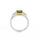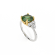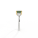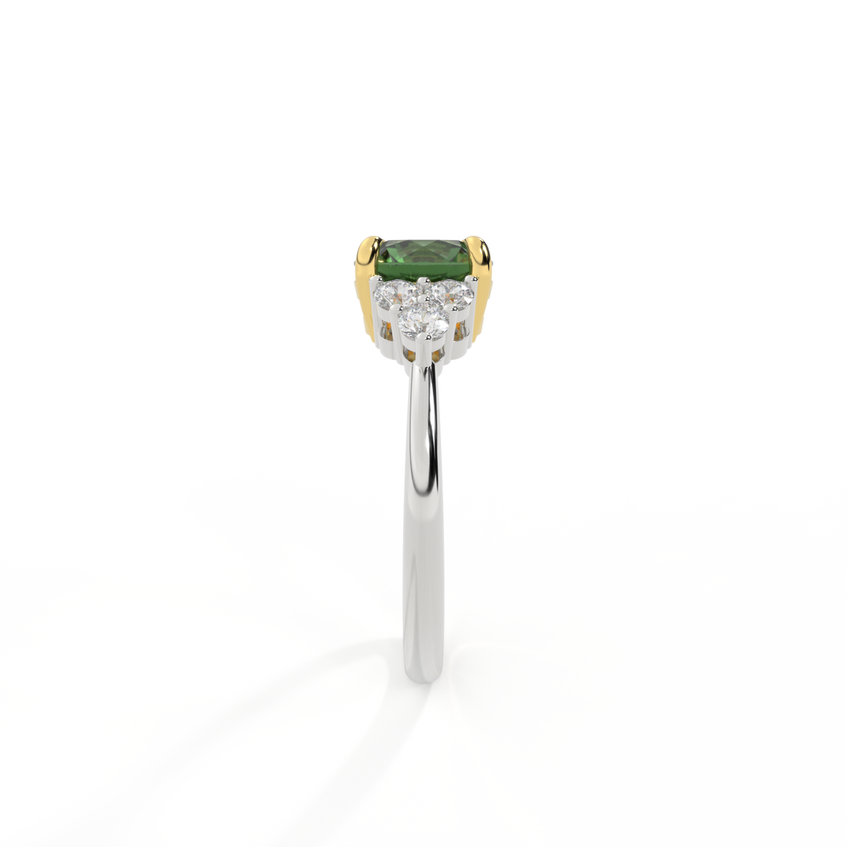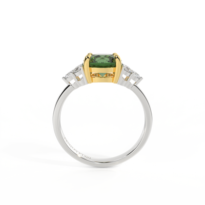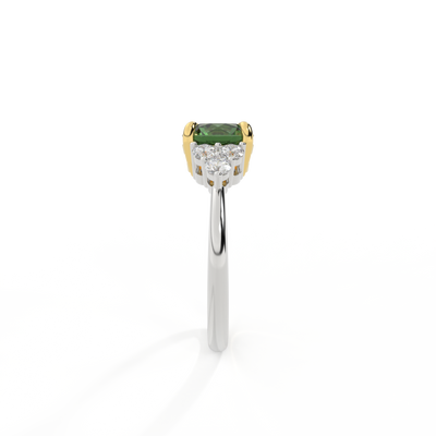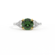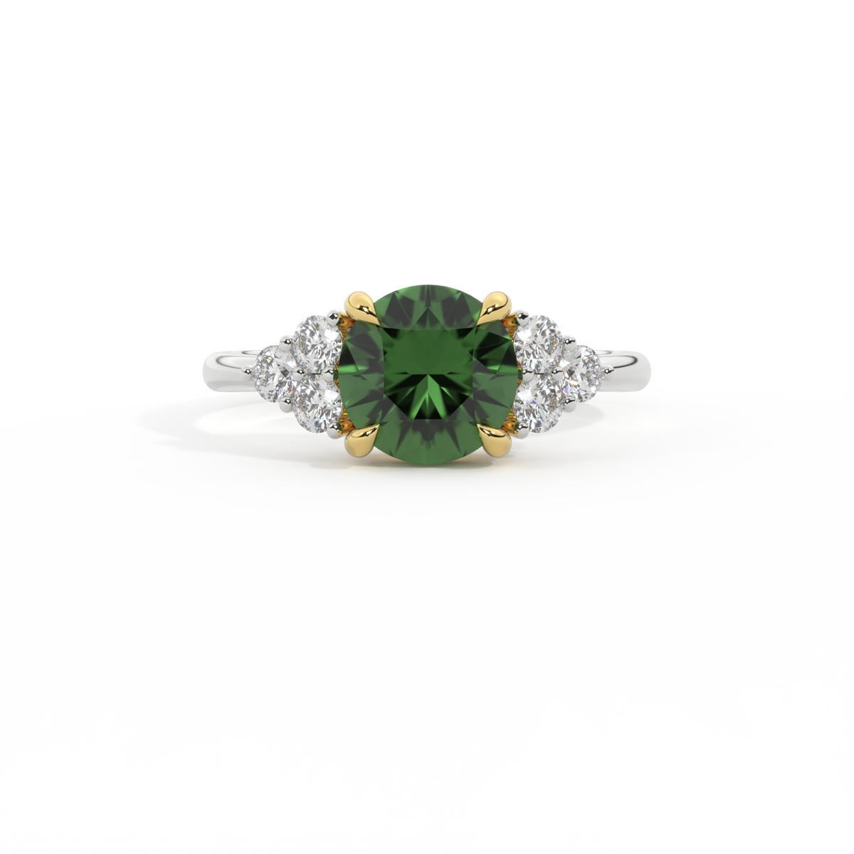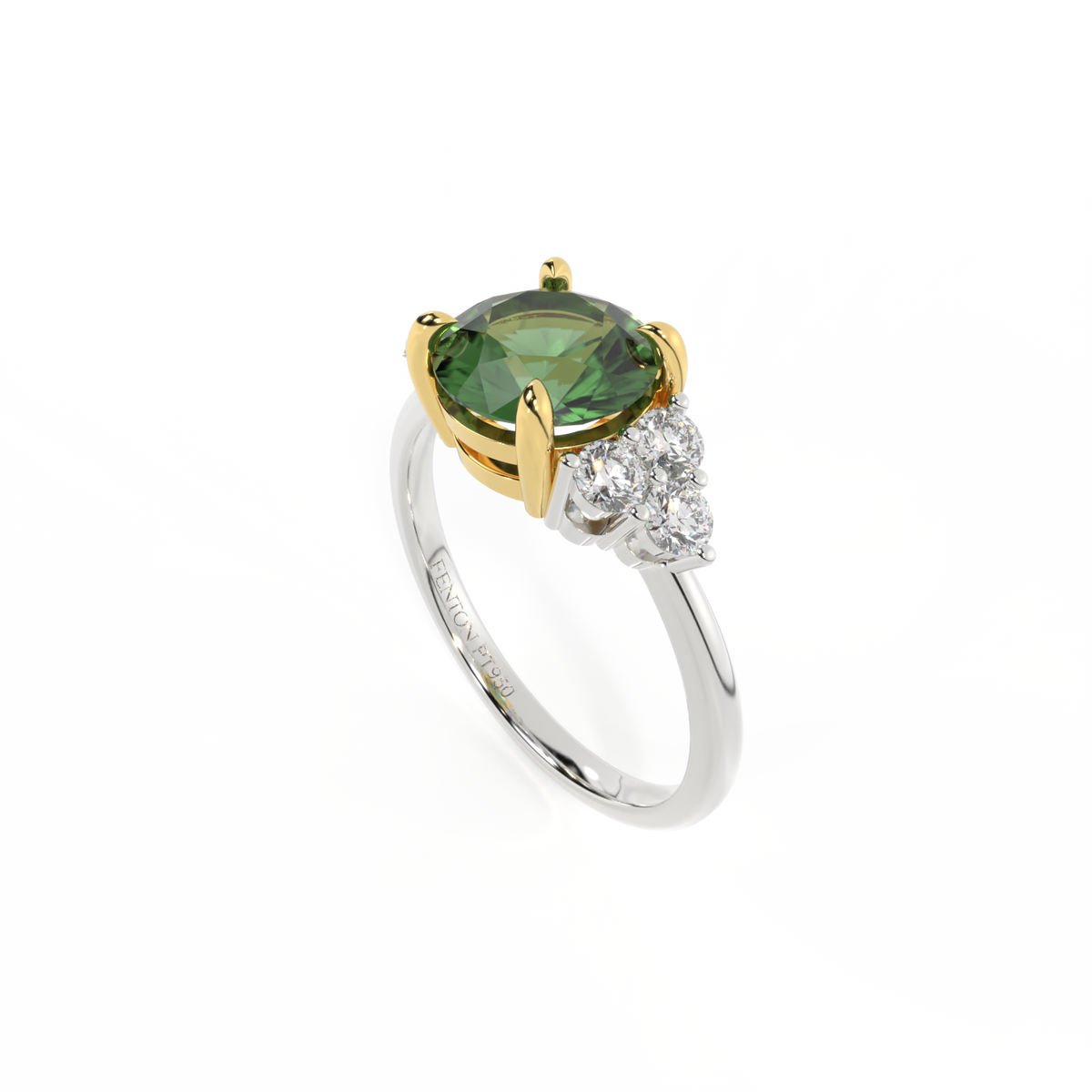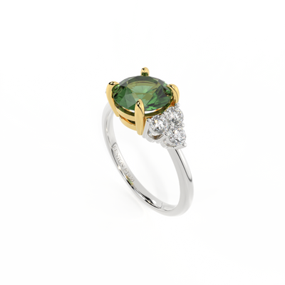 Your glistening Round cut Green Sapphire is framed on either side by a trefoil cluster of three 1.8mm round brilliant cut GH/VS diamonds, each securely held into place in a claw setting. The design draws the eye to the glistening Ruby center stone, sitting proudly in a classic open gallery setting crafted from solid, recycled 18K gold or platinum. The open setting of this design allows the light to reflect in all directions, creating a lustrous and sparkling look.