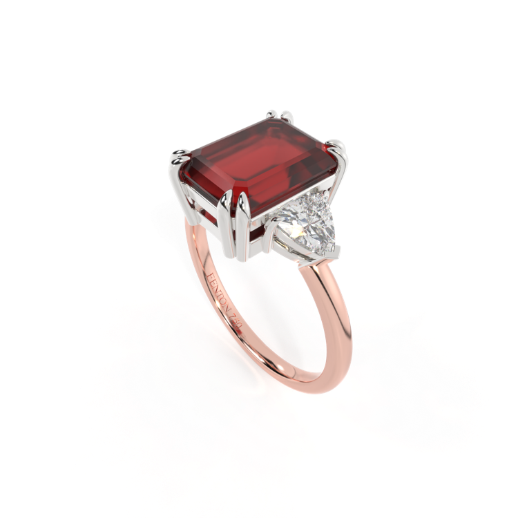 All of our rings are available in blue sapphire, ruby, emerald, pink sapphire, yellow sapphire, garnet and aquamarine. We offer three metals, 18K rose gold, 18K yellow gold and platinum. The center stones are available in four cuts, round, cushion, oval and emerald cut and five sizes for each cut and style.