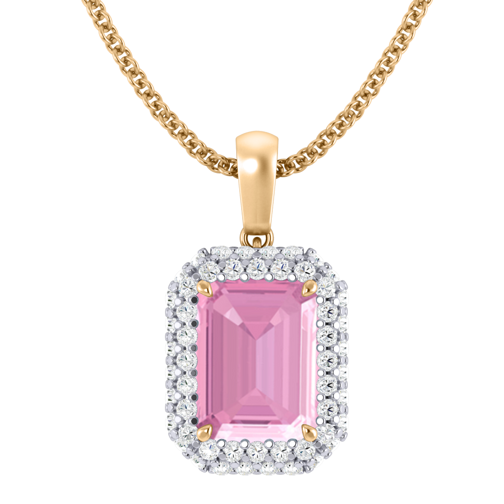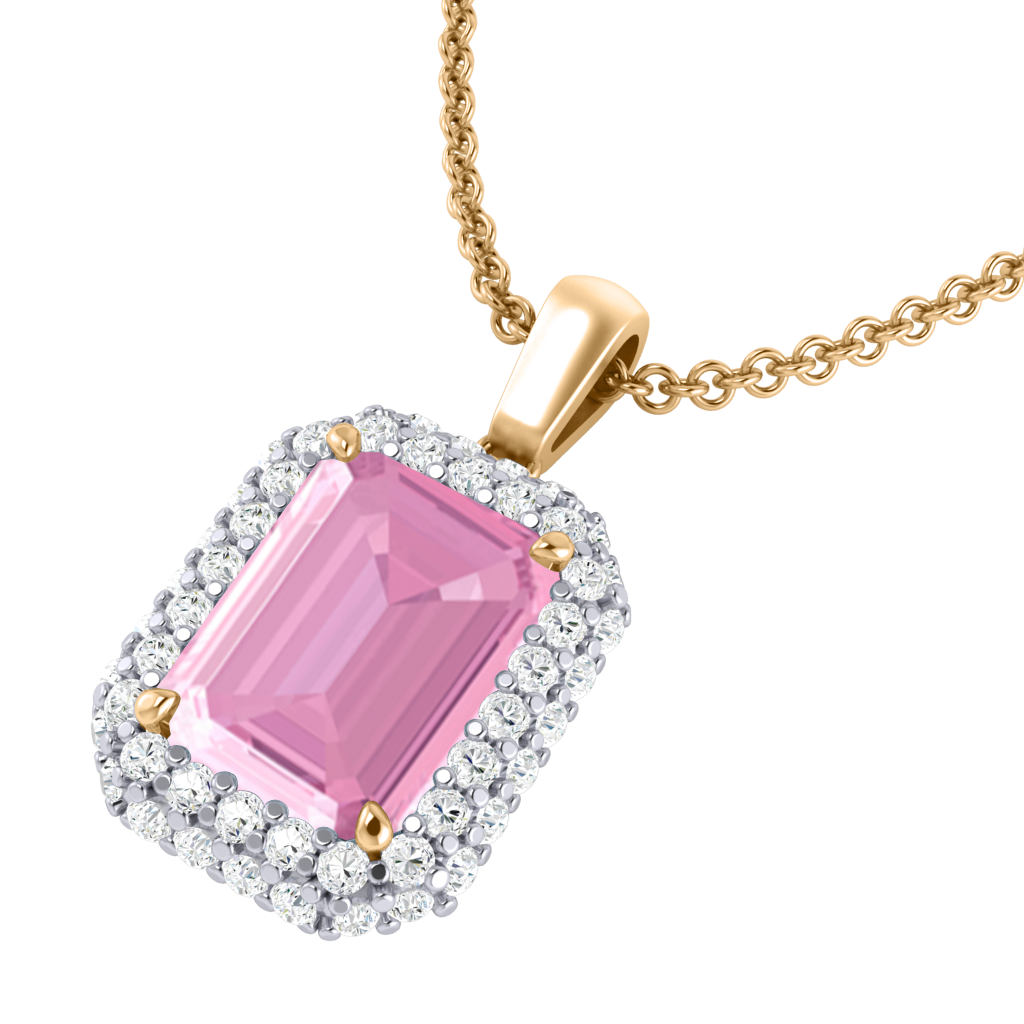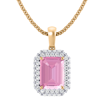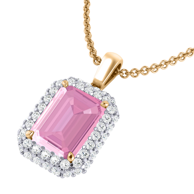 Wear your Pink Sapphire close to your heart with our Vintage Pendant Necklace. The sparkling Emerald cut Pink Sapphire pedant is framed with a double halo of G/H color and VS clarity diamonds giving the necklace its much-loved vintage aesthetic inspired by 18th century Jewelry pieces.