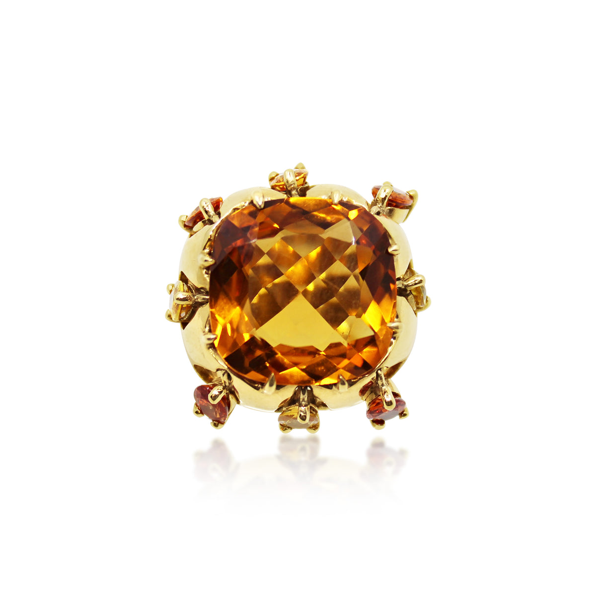 1950’s citrine cocktail ring, set to center with a cushion-shaped citrine with a border of eight vari-hued articulated oval citrine drops, within a pierced openwork 18ct gold mount, size K ½