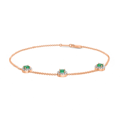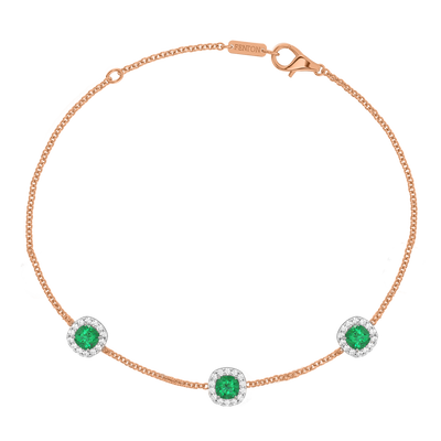 Le bracelet Garland en Émeraude est un équilibre entre le romantisme féminin et le style intemporel. Ce modèle délicat présente trois pierres Coussin Émeraude dans une monture à griffes classique entourée d'un halo scintillant de diamants de couleur G/H et de pureté VS pour créer un bijou à chérir pour toujours. Le motif à trois pierres est l'un des favoris de Fenton et rappelle une guirlande florale, l'un des symboles les plus universels de l'amour.