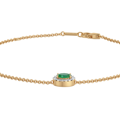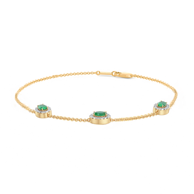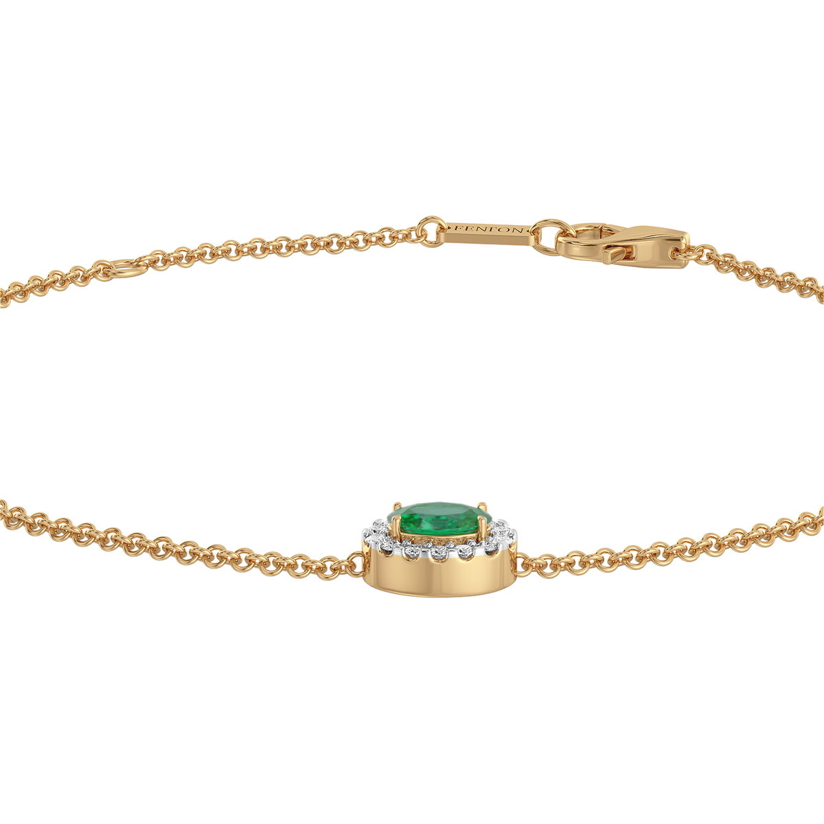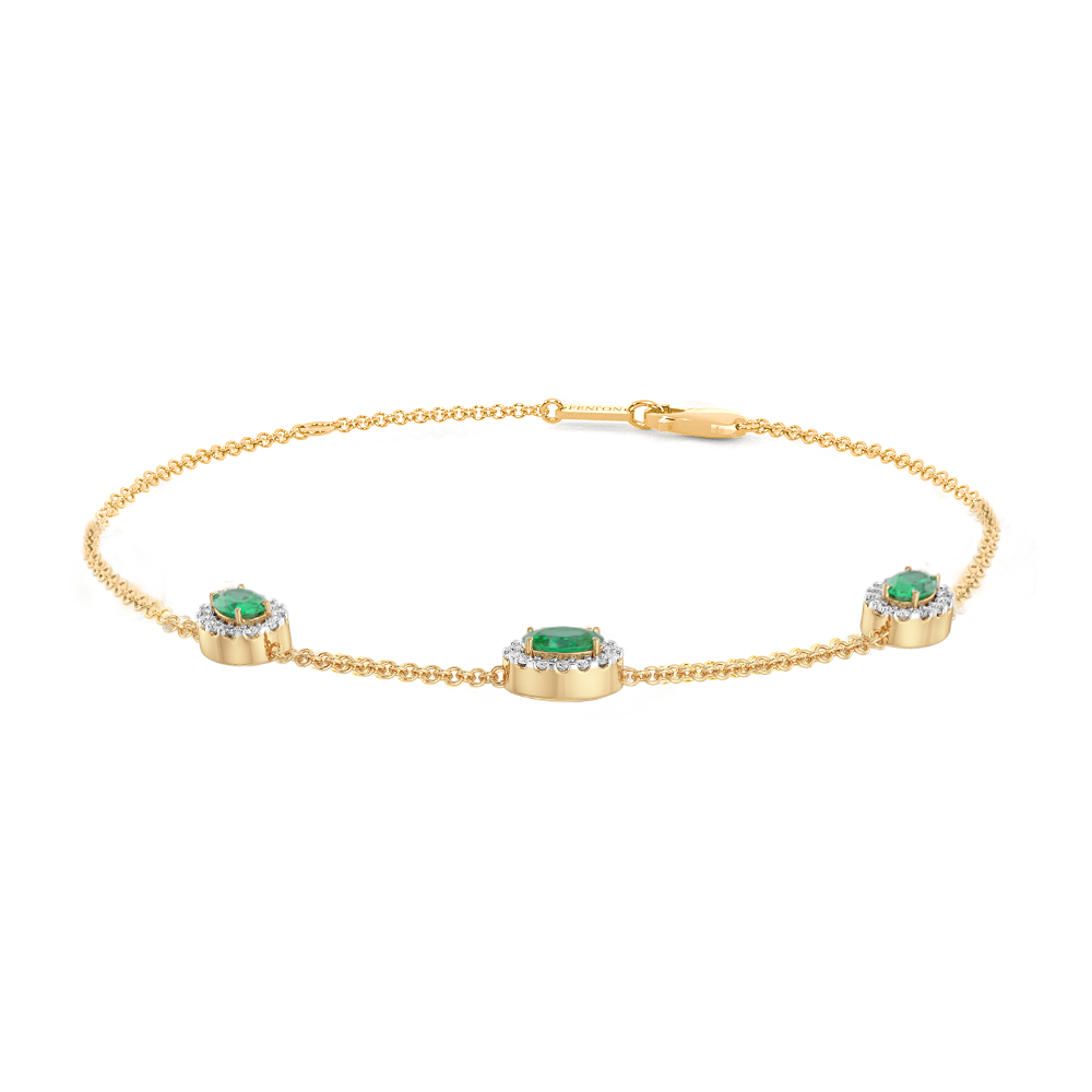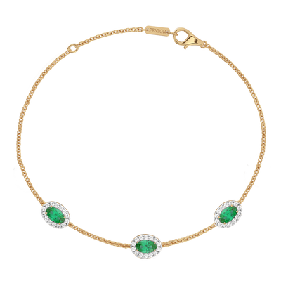 Le bracelet Garland en Émeraude est un équilibre entre le romantisme féminin et le style intemporel. Ce modèle délicat présente trois pierres Ovale Émeraude dans une monture à griffes classique entourée d'un halo scintillant de diamants de couleur G/H et de pureté VS pour créer un bijou à chérir pour toujours. Le motif à trois pierres est l'un des favoris de Fenton et rappelle une guirlande florale, l'un des symboles les plus universels de l'amour.