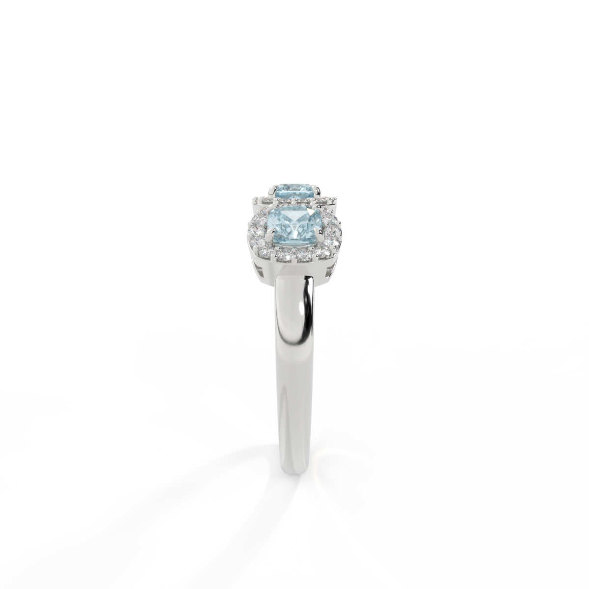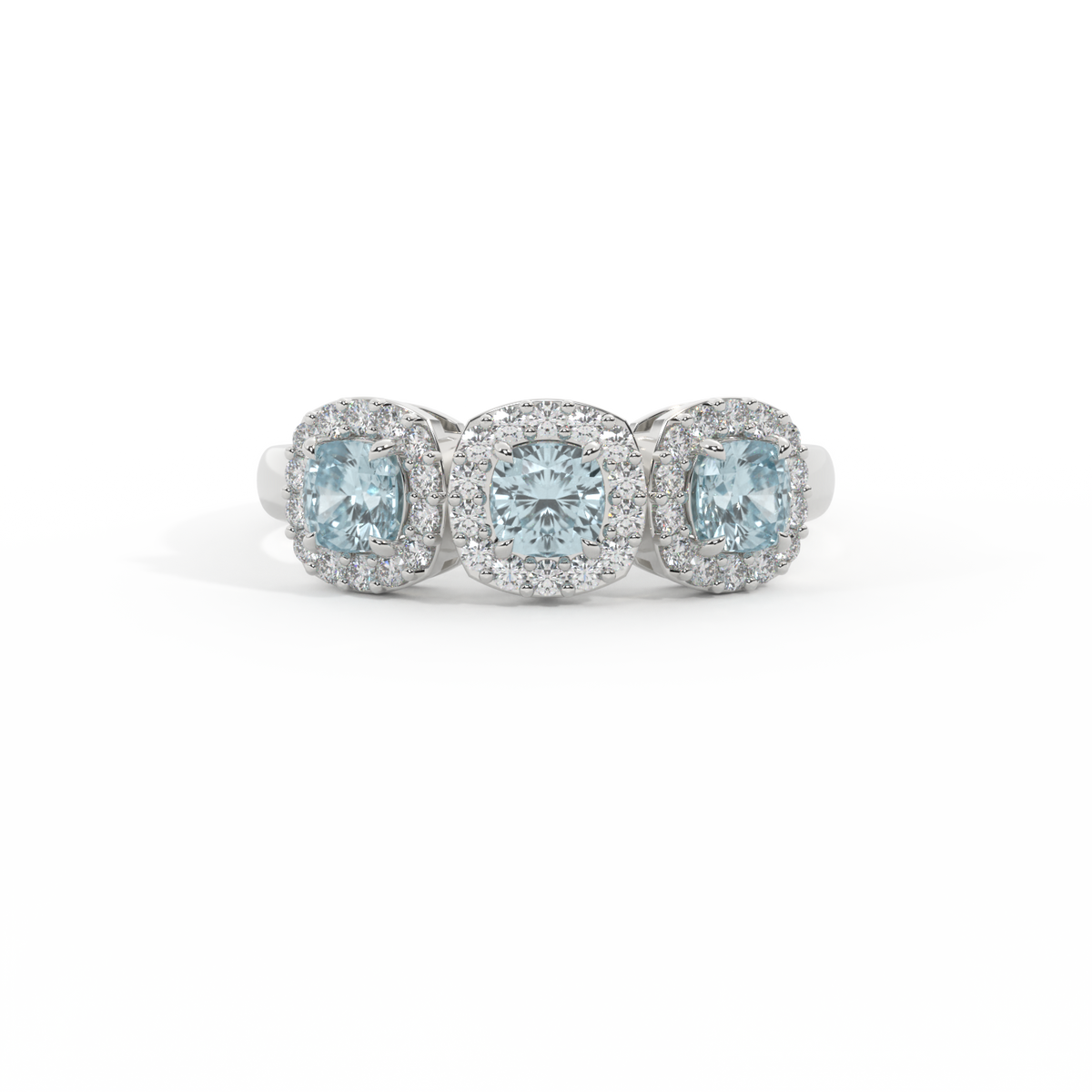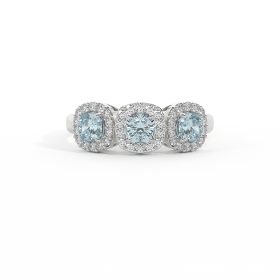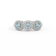 Cette parure basse, d'une beauté super portable, rappelle une guirlande florale, l'un des symboles les plus universels de l'amour. Trois pierres Coussin taillées Aigue-Marine sont entourées de halos de diamants, chaque pierre étant totalement unique.