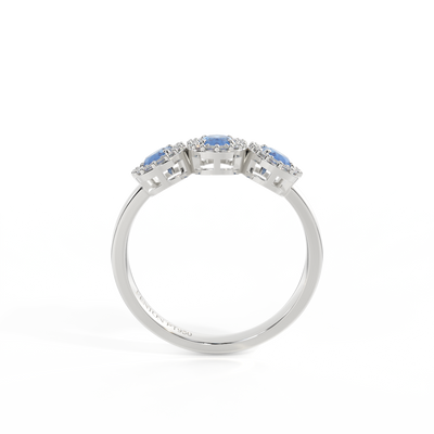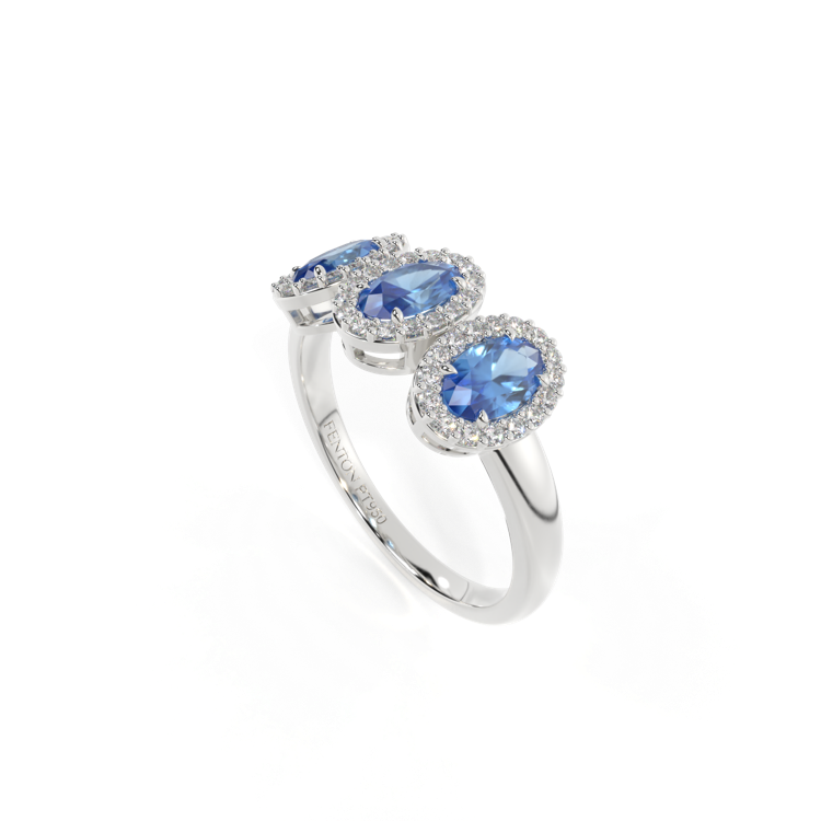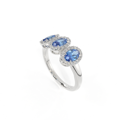 Cette parure basse, d'une beauté super portable, rappelle une guirlande florale, l'un des symboles les plus universels de l'amour. Trois pierres Ovale taillées Saphir Bleu sont entourées de halos de diamants, chaque pierre étant totalement unique.