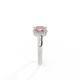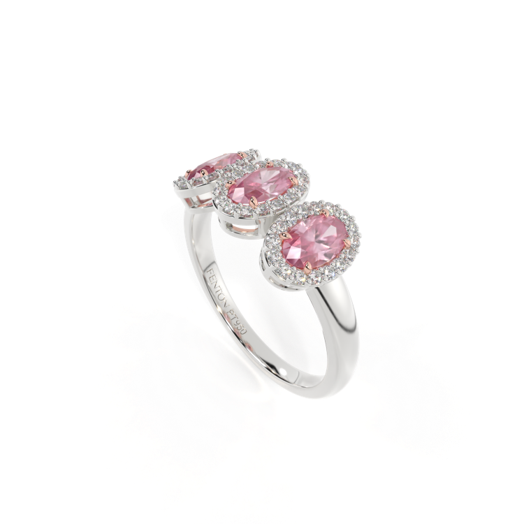 Cette parure basse, d'une beauté super portable, rappelle une guirlande florale, l'un des symboles les plus universels de l'amour. Trois pierres Ovale taillées Saphir Rose sont entourées de halos de diamants, chaque pierre étant totalement unique.