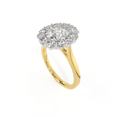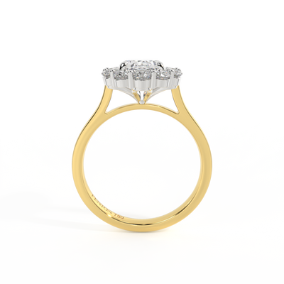 Your glistening Oval Lab Grown Diamond has a GH V/S quality rating and is framed on either side by a trefoil cluster of three 1.8mm round brilliant cut Diamond stones, each securely held into place in a claw setting. The design draws the eye to the glistening Lab Grown Diamond centre stone, sitting proudly in a classic open gallery setting crafted from solid 18K Yellow Gold. The open setting of this design allows the light to reflect in all directions, creating a lustrous and sparkling look.