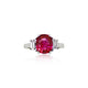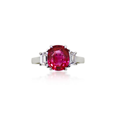 Ruby and diamond ring, claw-set with an oval ruby weighing 3.10cts flanked by two trapeze-cut diamonds weighing 0.65ct each, mounted in platinum, size M, with SSEF certificate no. 128605 dated 19th April 2023 stating the ruby is Burmese origin, no indications of heating