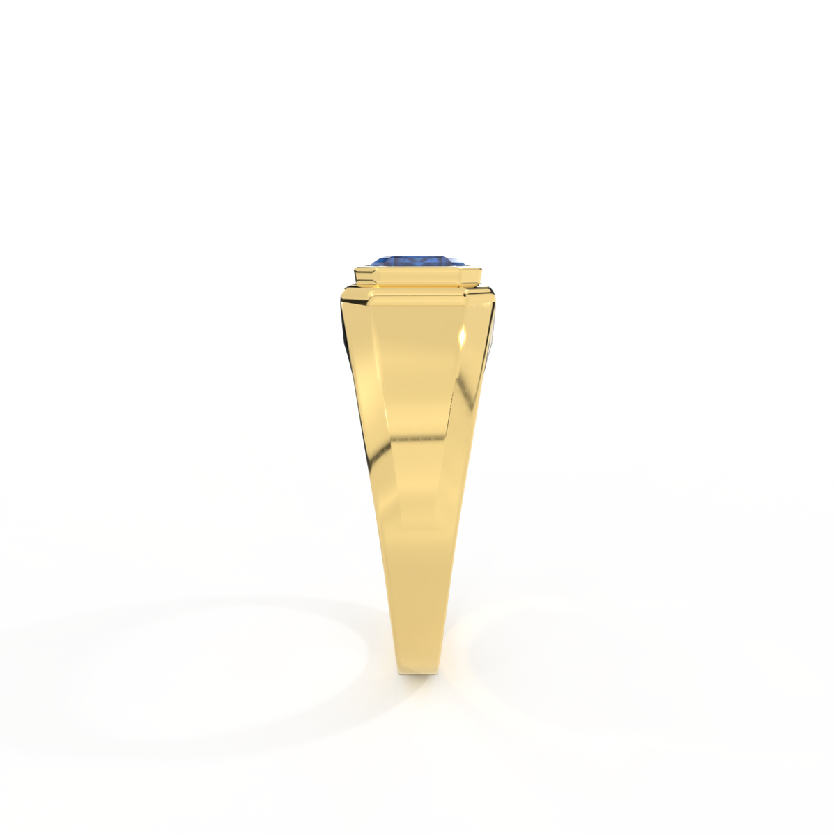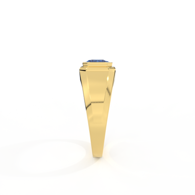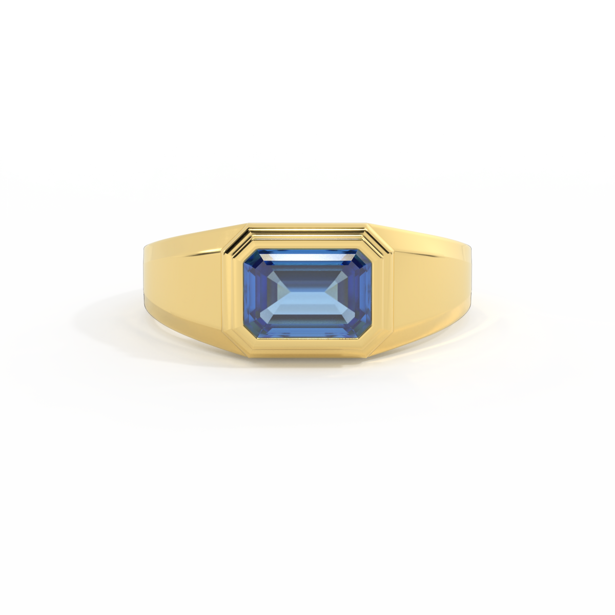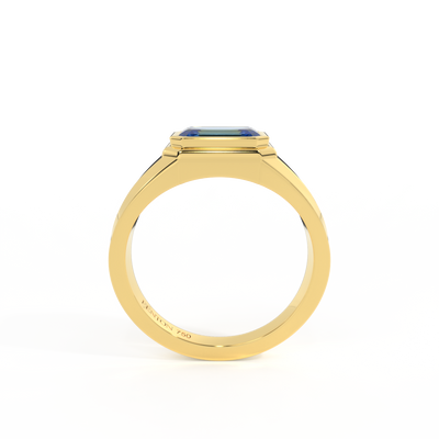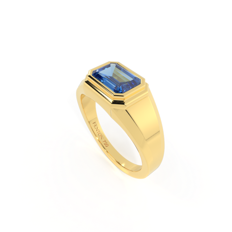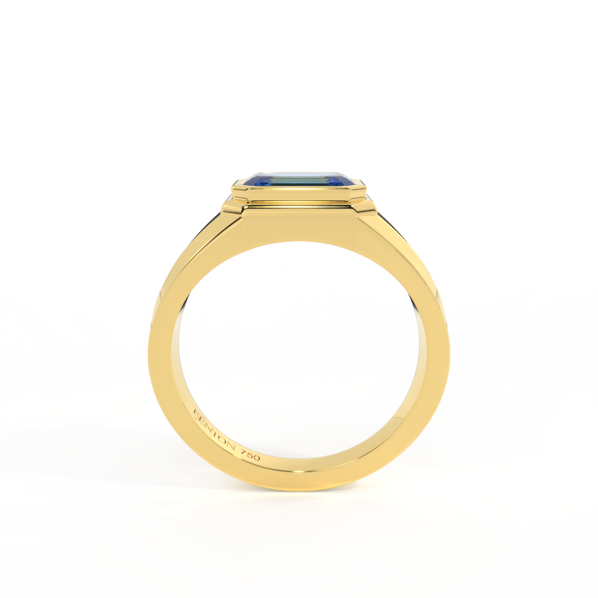 Cette pièce emblématique est sertie d'un Saphir Bleu taillé en Émeraude, qui se dresse légèrement au-dessus de la bande 18K Or Jaune dans une monture à lunette étagée. Les épaules s'effilent vers le centre, avec une tige arrondie pour un confort maximal. Un héritage moderne pour le quotidien.