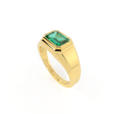 Cette pièce emblématique est sertie d'un Émeraude taillé en Émeraude, qui se dresse légèrement au-dessus de la bande 18K Or Jaune dans une monture à lunette étagée. Les épaules s'effilent vers le centre, avec une tige arrondie pour un confort maximal. Un héritage moderne pour le quotidien.