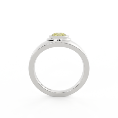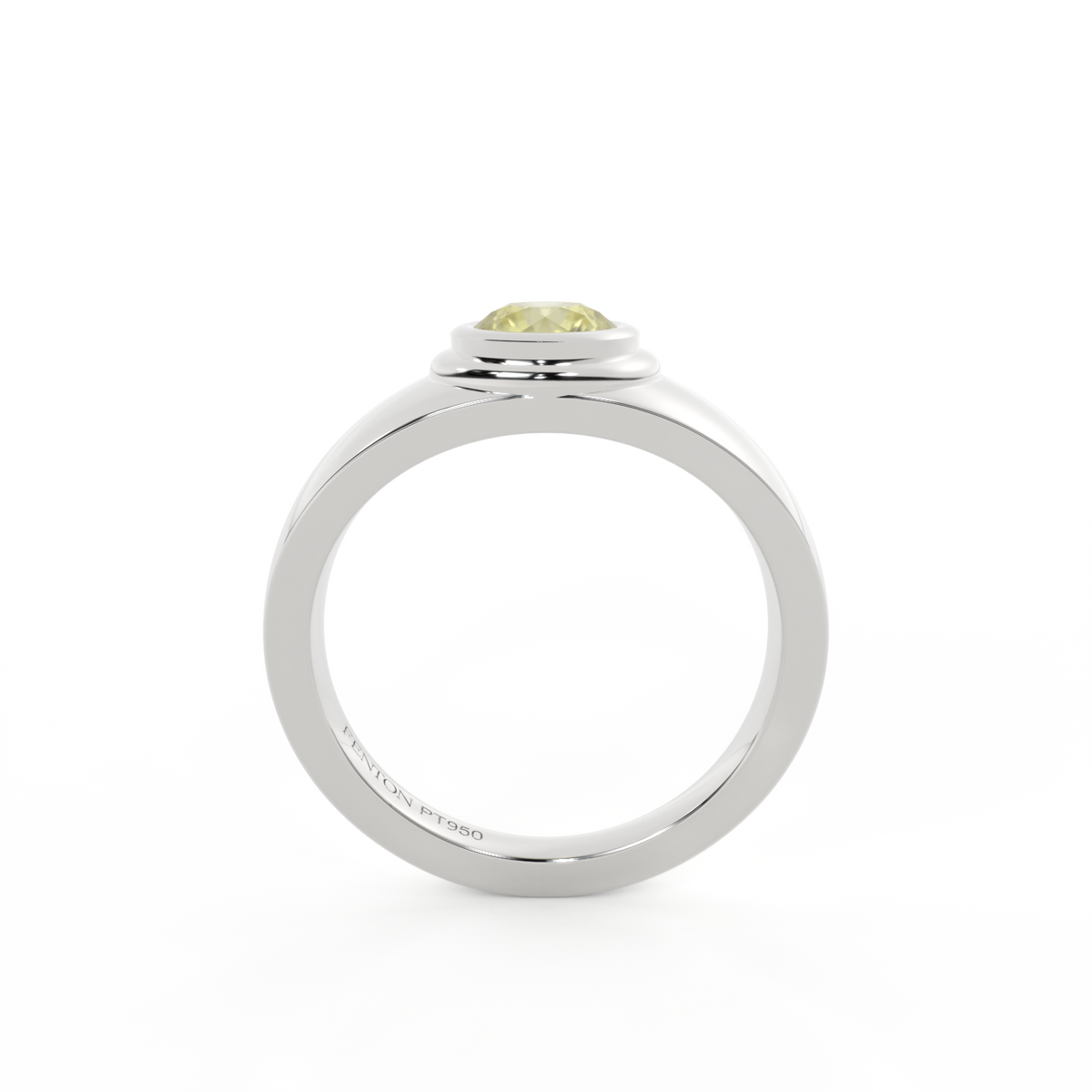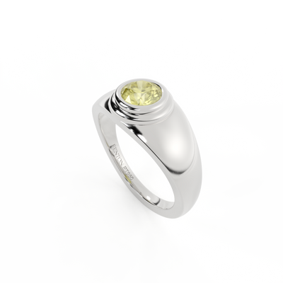 Cette pièce emblématique est sertie d'un Saphir Jaune taillé en Rond, qui se dresse légèrement au-dessus de la bande 18K Or Blanc dans une monture à lunette étagée. Les épaules s'effilent vers le centre, avec une tige arrondie pour un confort maximal. Un héritage moderne pour le quotidien.