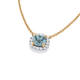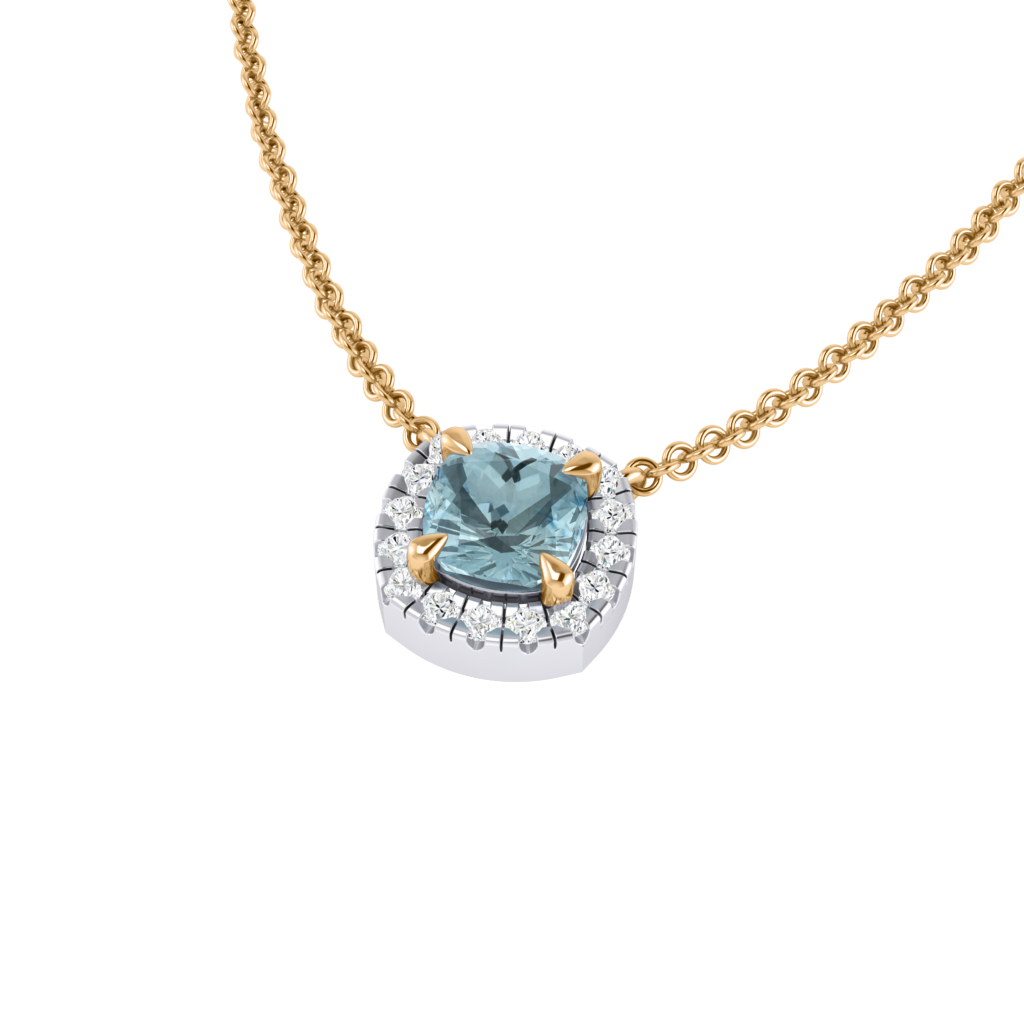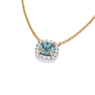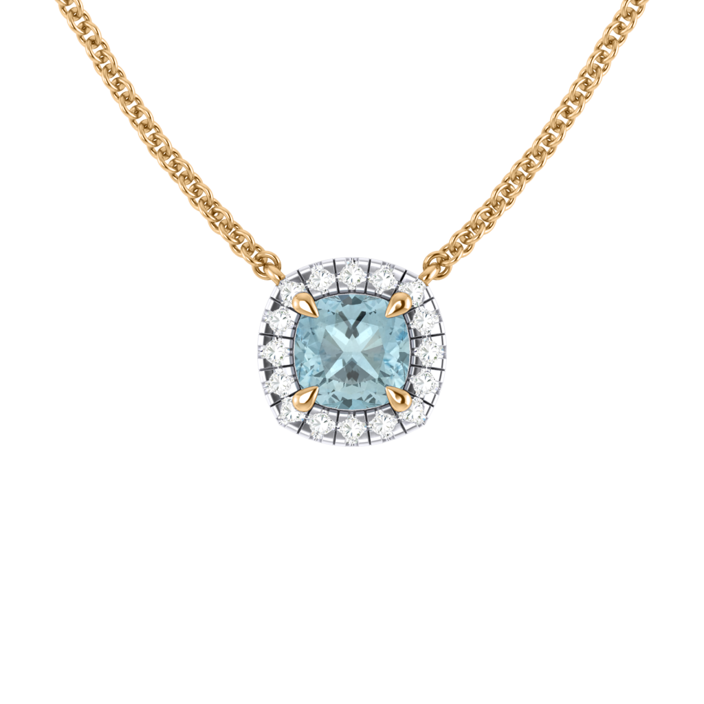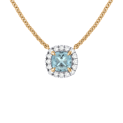 Le collier Classic est le cadeau idéal pour toutes les occasions. Une chaîne solide 18K Or Jaune maintient fermement un étincelant Coussin cut Aigue-Marine au centre du collier, entouré d'un halo de diamants ronds de taille brillant pavés de couleur G/H et de clarté VS. Le collier Classic est la combinaison parfaite du meilleur savoir-faire et d'une élégance discrète.