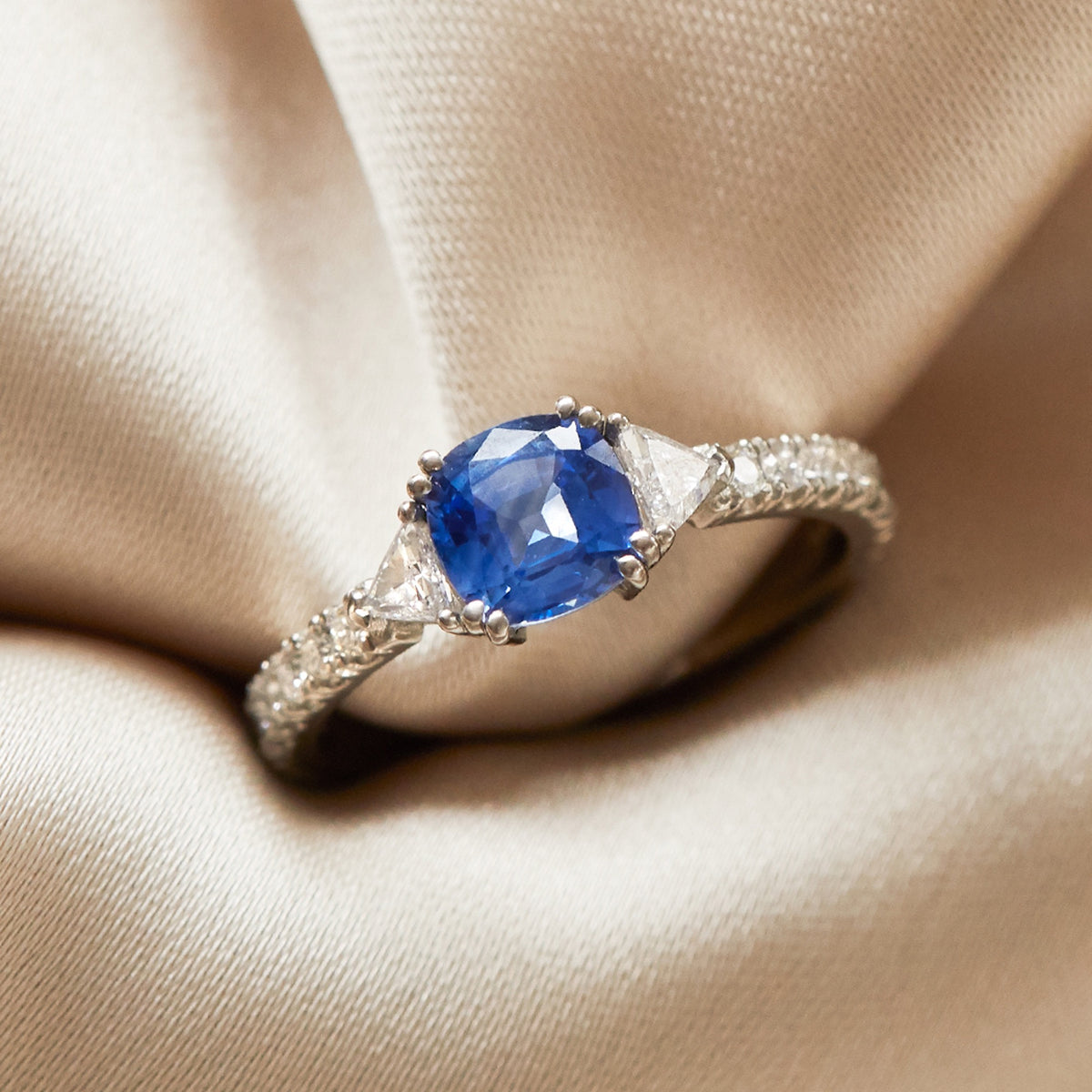 Preuve que trois n'est pas toujours une foule, notre bague Trilogy réunit une pierre centrale de couleur et deux diamants GH VS qui l'entourent. Choisissez votre propre coupe et votre pierre centrale pour créer votre propre version de ce design élégant.