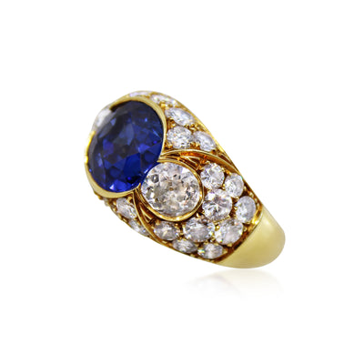Sapphire and diamond ring, set with an oval sapphire weighing approx. 3.30cts within an old mine and brilliant-cut diamond bombé surround, mounted in 18ct yellow gold, size H ½ with Gem & Pearl Laboratory certificate nr. 26208 dated 29th July 2025 stating the sapphire is Ceylon (Sri Lanka) origin, no evidence of heat treatment