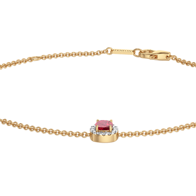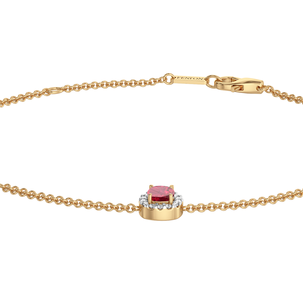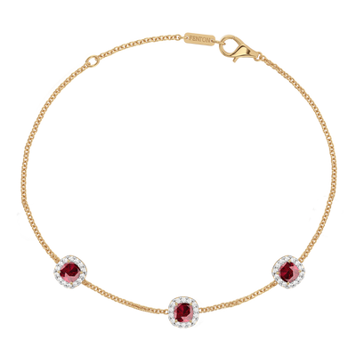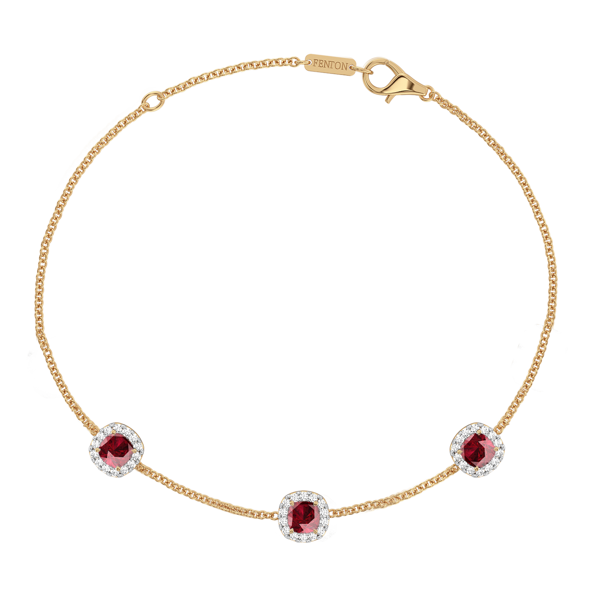 Le bracelet Garland en Rubis est un équilibre entre le romantisme féminin et le style intemporel. Ce modèle délicat présente trois pierres Coussin Rubis dans une monture à griffes classique entourée d'un halo scintillant de diamants de couleur G/H et de pureté VS pour créer un bijou à chérir pour toujours. Le motif à trois pierres est l'un des favoris de Fenton et rappelle une guirlande florale, l'un des symboles les plus universels de l'amour.