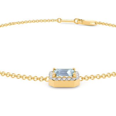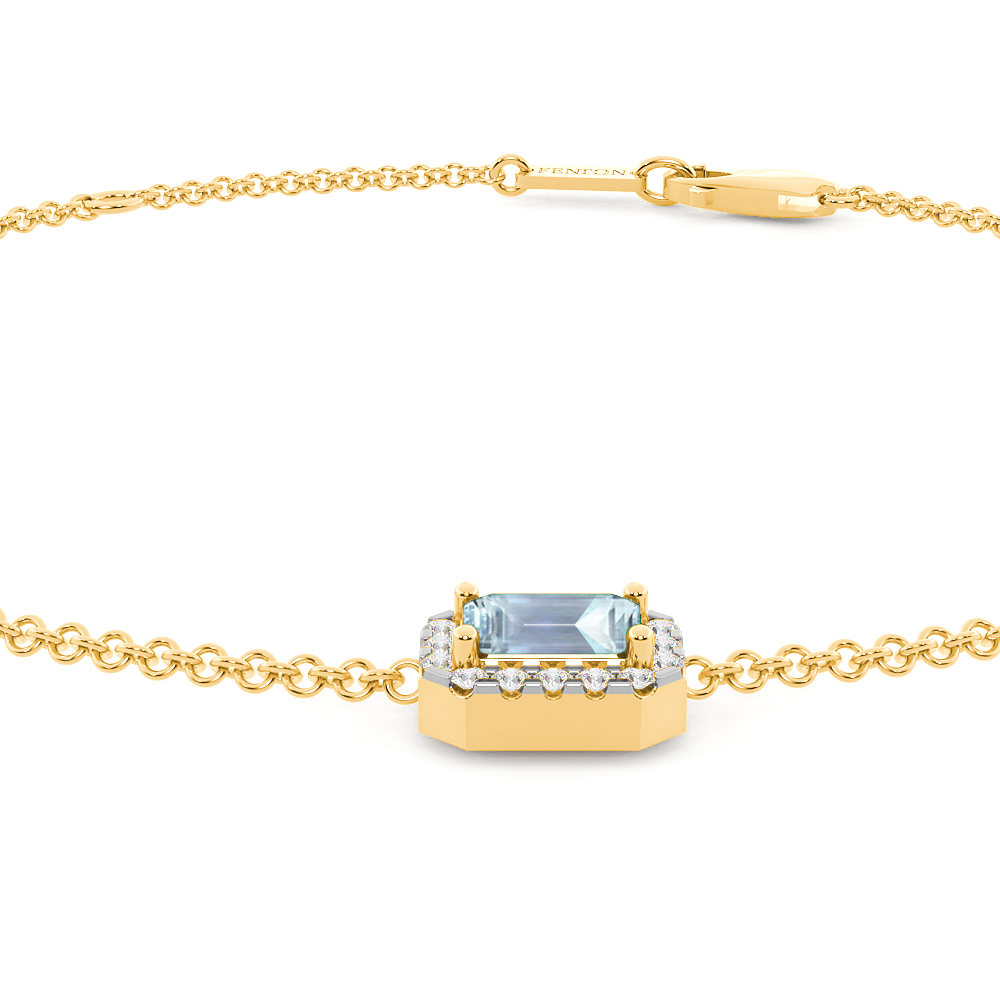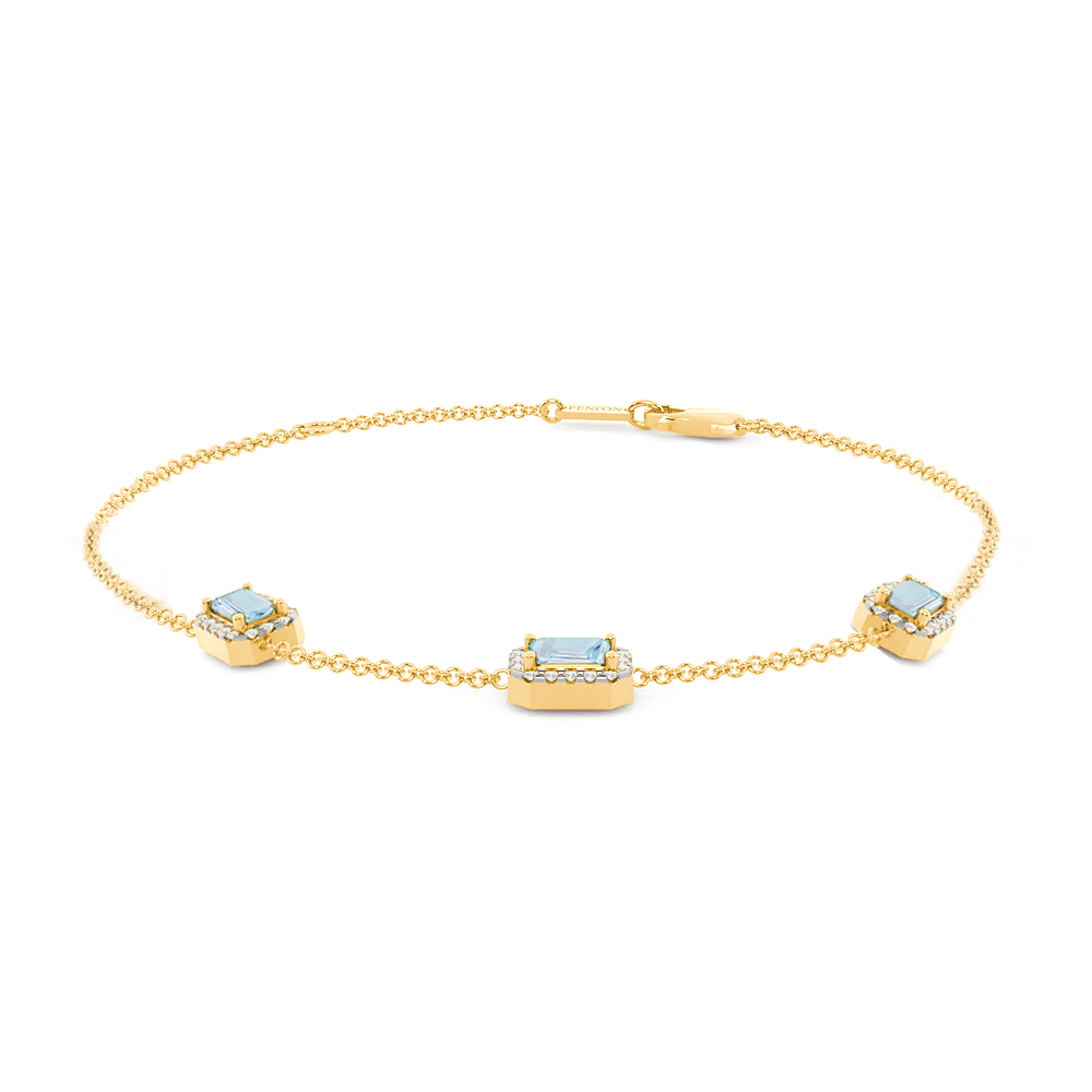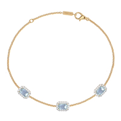 Le bracelet Garland en Aigue-Marine est un équilibre entre le romantisme féminin et le style intemporel. Ce modèle délicat présente trois pierres Émeraude Aigue-Marine dans une monture à griffes classique entourée d'un halo scintillant de diamants de couleur G/H et de pureté VS pour créer un bijou à chérir pour toujours. Le motif à trois pierres est l'un des favoris de Fenton et rappelle une guirlande florale, l'un des symboles les plus universels de l'amour.
