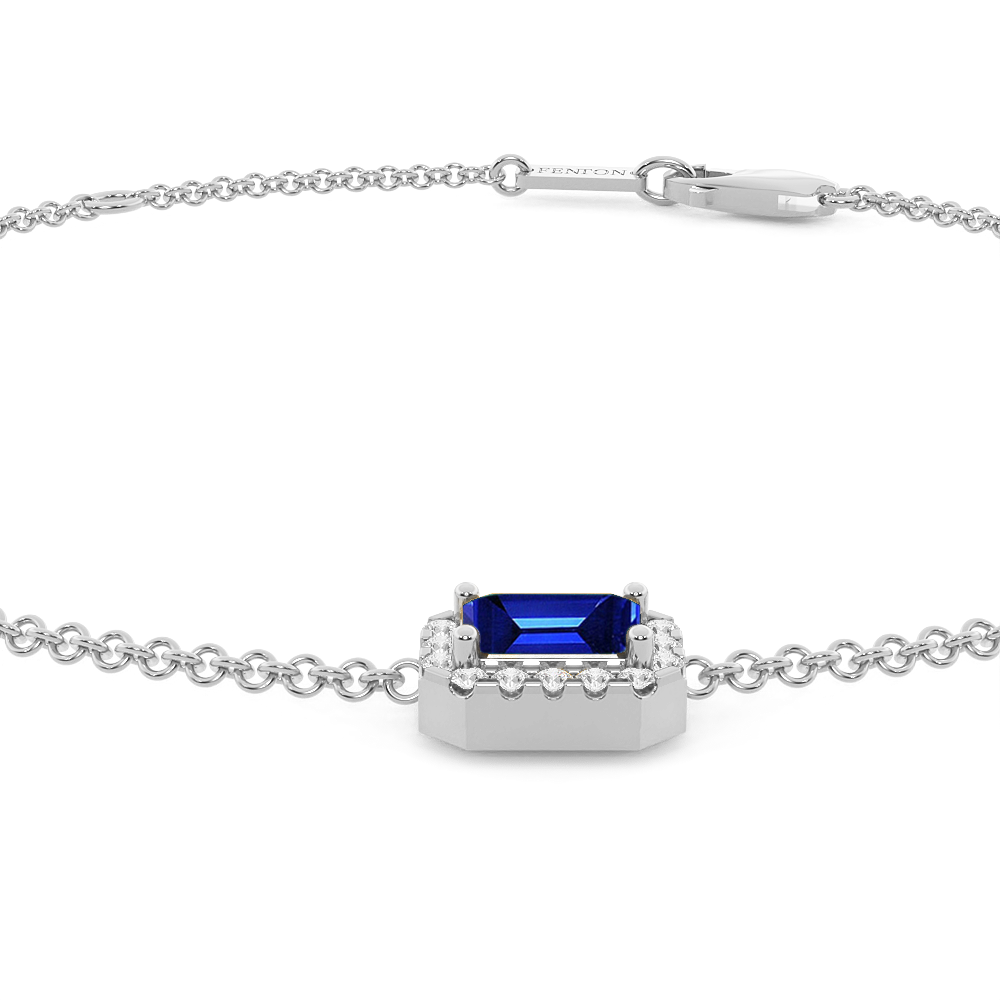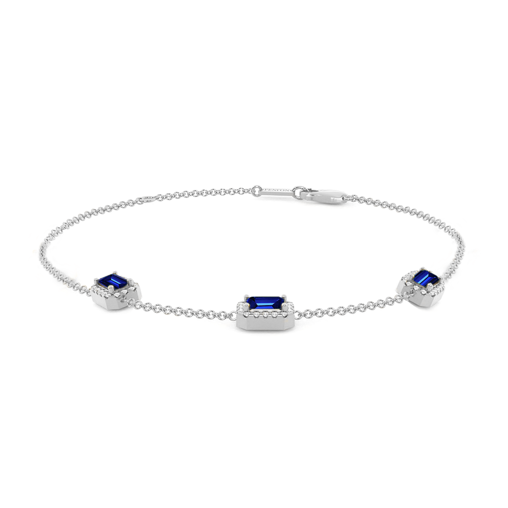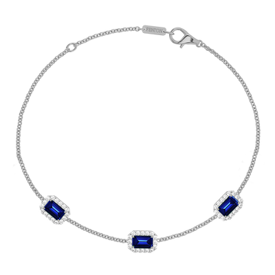 Le bracelet Garland en Saphir Bleu est un équilibre entre le romantisme féminin et le style intemporel. Ce modèle délicat présente trois pierres Émeraude Saphir Bleu dans une monture à griffes classique entourée d'un halo scintillant de diamants de couleur G/H et de pureté VS pour créer un bijou à chérir pour toujours. Le motif à trois pierres est l'un des favoris de Fenton et rappelle une guirlande florale, l'un des symboles les plus universels de l'amour.