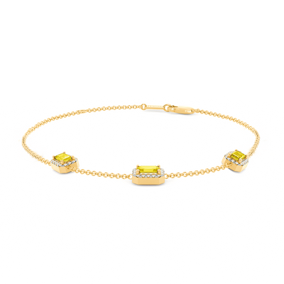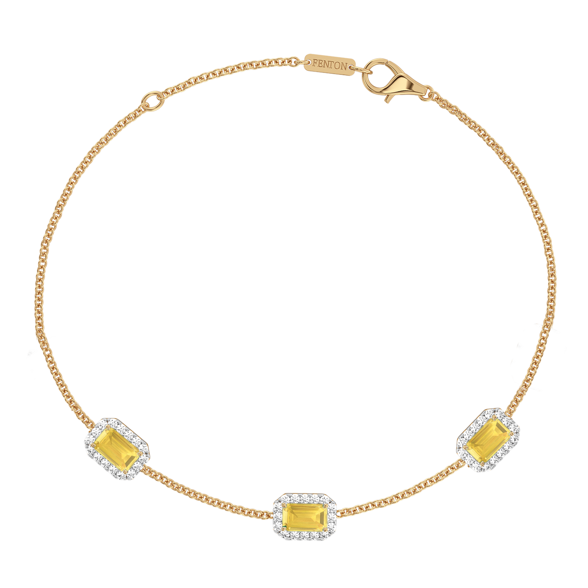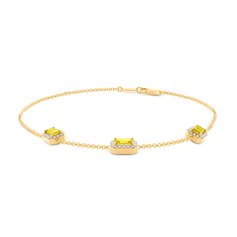Le bracelet Garland en Saphir Jaune est un équilibre entre le romantisme féminin et le style intemporel. Ce modèle délicat présente trois pierres Émeraude Saphir Jaune dans une monture à griffes classique entourée d'un halo scintillant de diamants de couleur G/H et de pureté VS pour créer un bijou à chérir pour toujours. Le motif à trois pierres est l'un des favoris de Fenton et rappelle une guirlande florale, l'un des symboles les plus universels de l'amour.