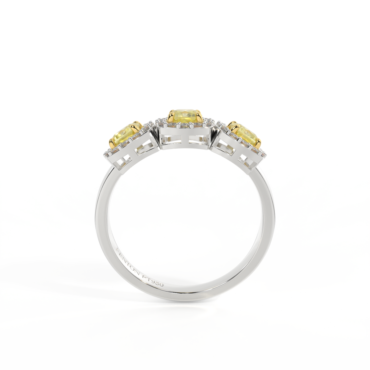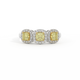 Cette parure basse, d'une beauté super portable, rappelle une guirlande florale, l'un des symboles les plus universels de l'amour. Trois pierres Coussin taillées Saphir Jaune sont entourées de halos de diamants, chaque pierre étant totalement unique.