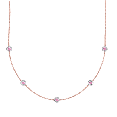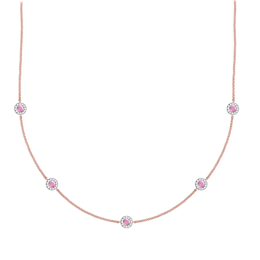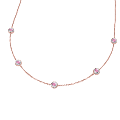 Notre collier Five Stone Halo Saphir Rose allie élégance intemporelle et pierres précieuses scintillantes, pour vous faire scintiller dans toutes les directions. Chacune de vos cinq pierres centrales Rond cut Saphir Rose est entourée d'un élégant halo de diamants de couleur G/H et de pureté VS mesurant 3 mm, tous espacés de manière égale pour faire une déclaration étincelante et sans effort.