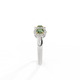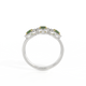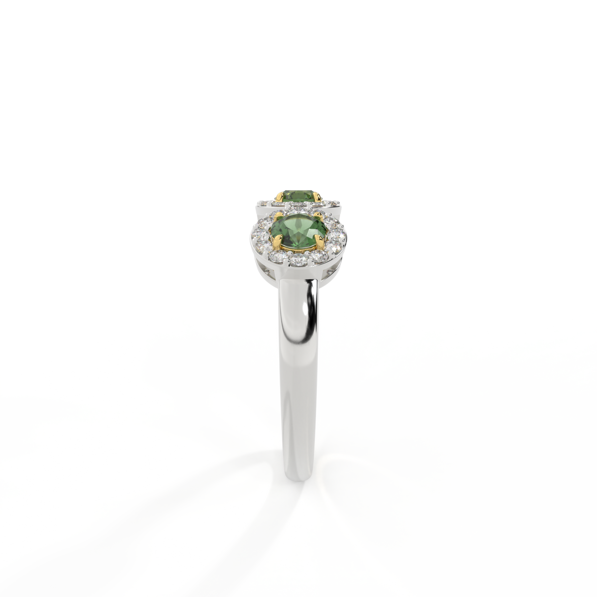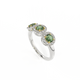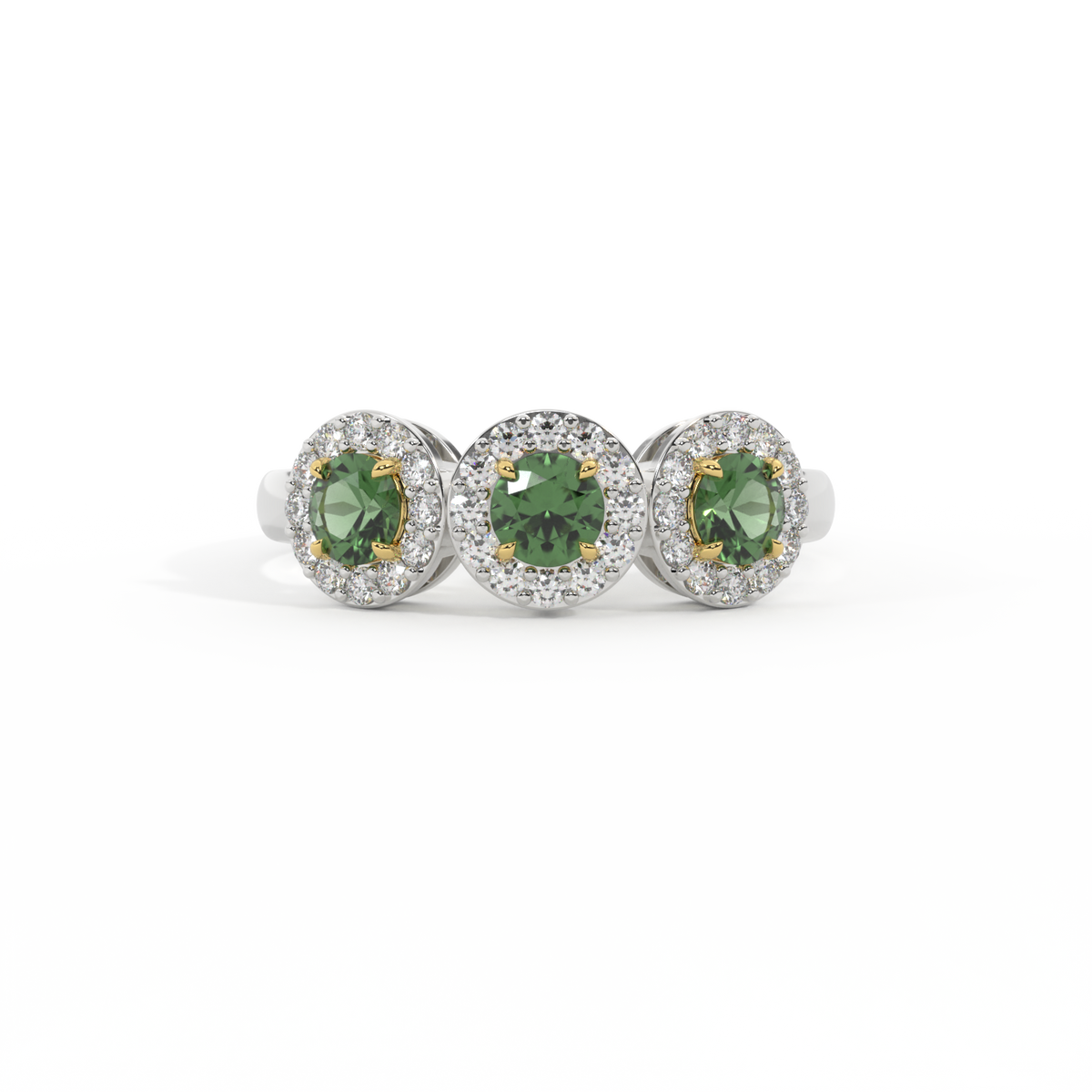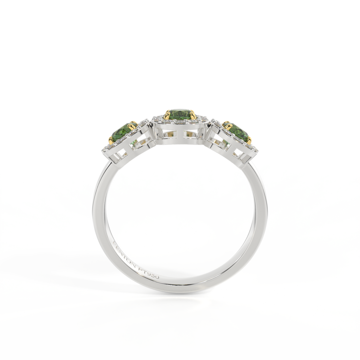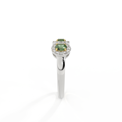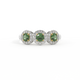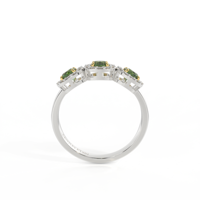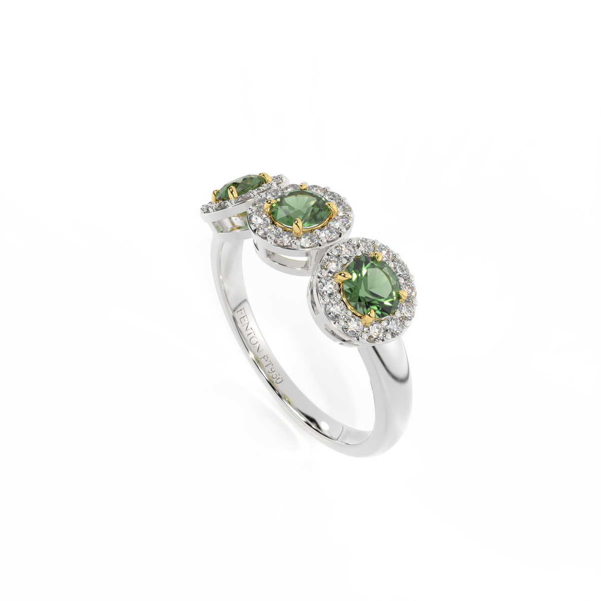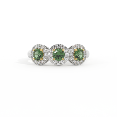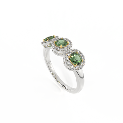 This low set, super wearable beauty, is reminiscent of a floral garland, one of the most universal symbols of love. Three Round cut Green Sapphire stones are surrounded by diamond halos, each stone is completely unique.