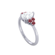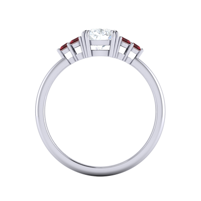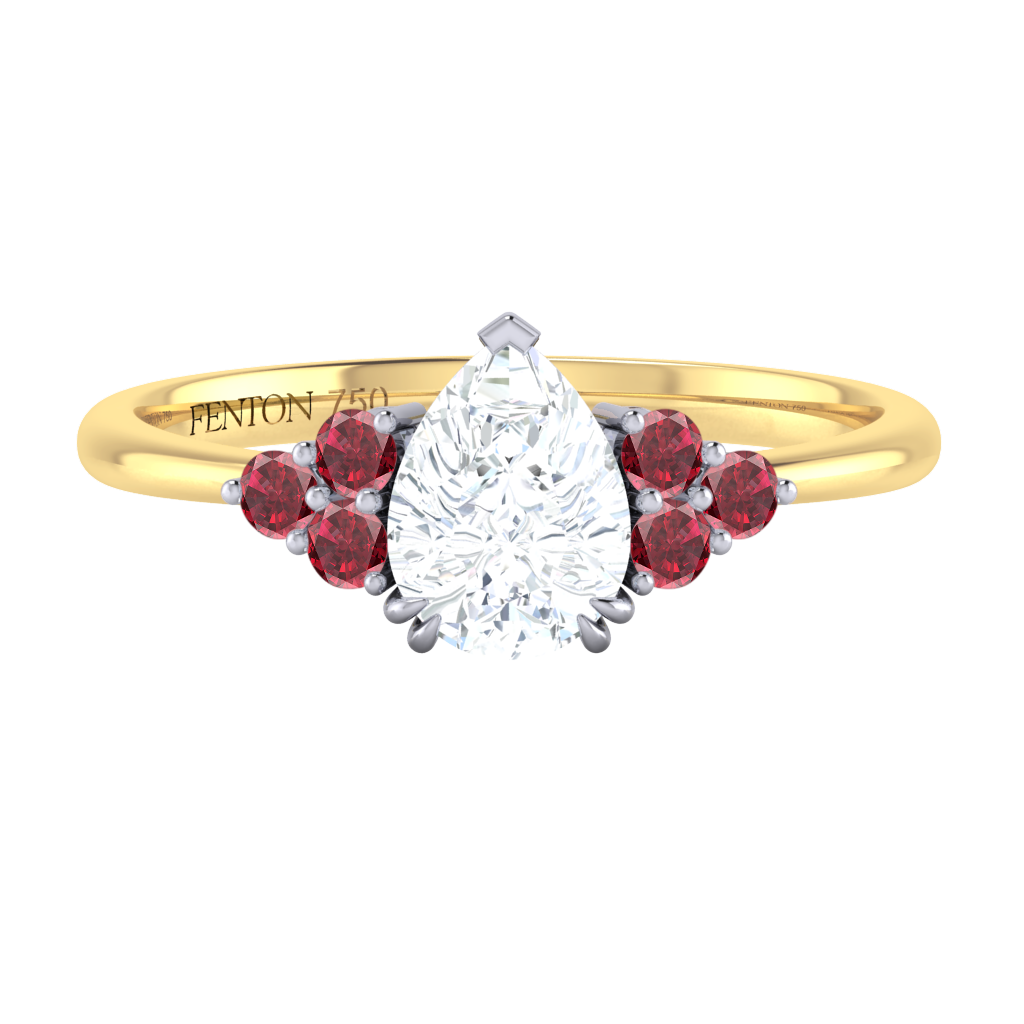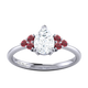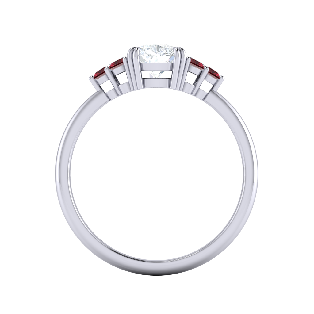 Your glistening undefined Naturally Mined Diamond has a GH V/S quality rating and is framed on either side by a trefoil cluster of three 1.8mm round brilliant cut Ruby stones, each securely held into place in a claw setting. The design draws the eye to the glistening Naturally Mined Diamond centre stone, sitting proudly in a classic open gallery setting crafted from solid Platinum. The open setting of this design allows the light to reflect in all directions, creating a lustrous and sparkling look.