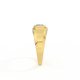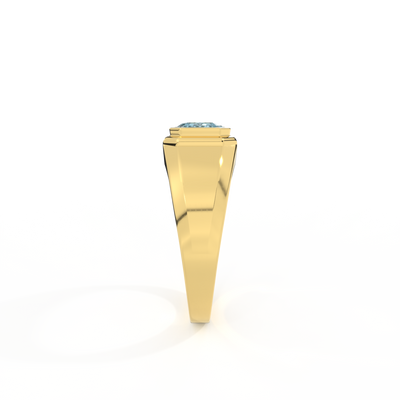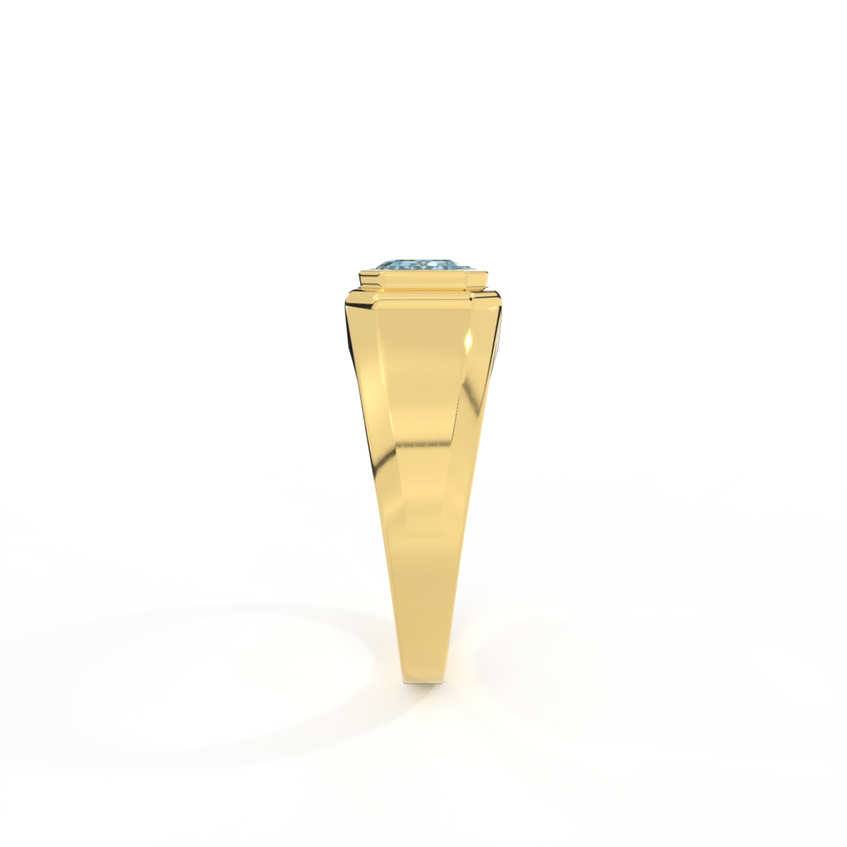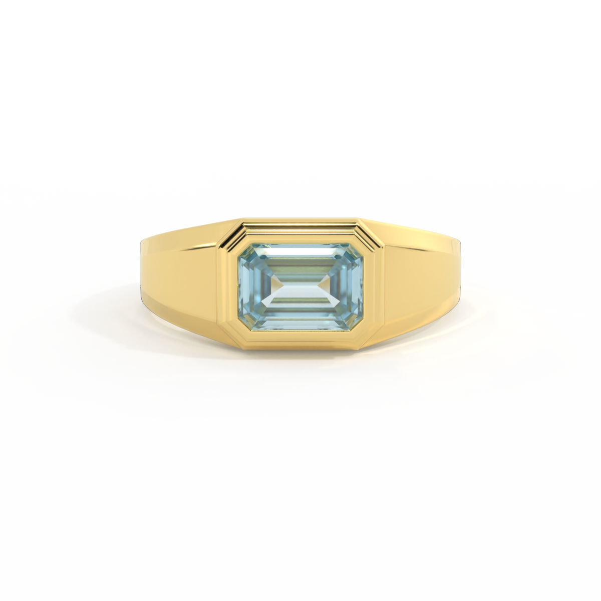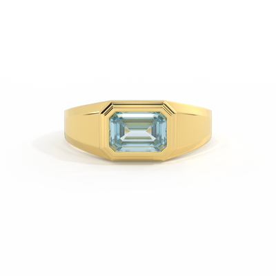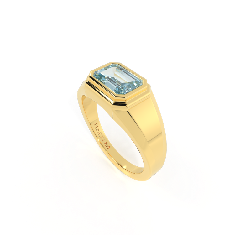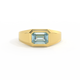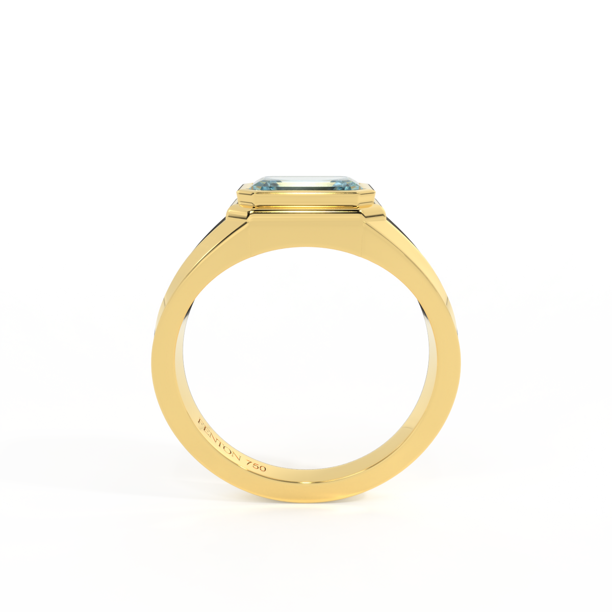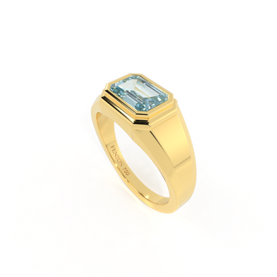 Cette pièce emblématique est sertie d'un Aigue-Marine taillé en Émeraude, qui se dresse légèrement au-dessus de la bande 18K Or Jaune dans une monture à lunette étagée. Les épaules s'effilent vers le centre, avec une tige arrondie pour un confort maximal. Un héritage moderne pour le quotidien.