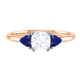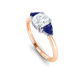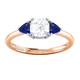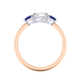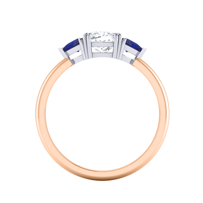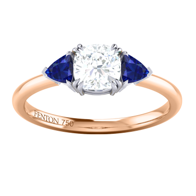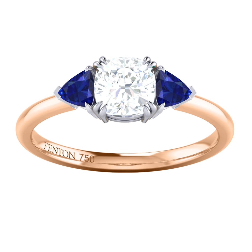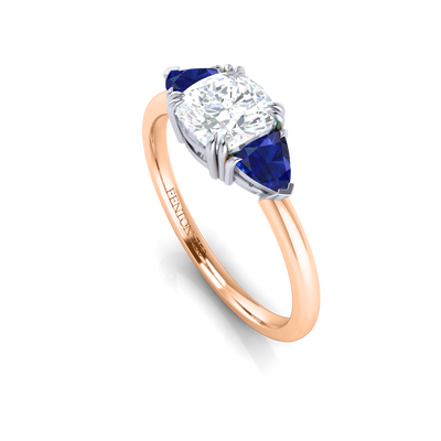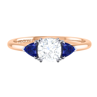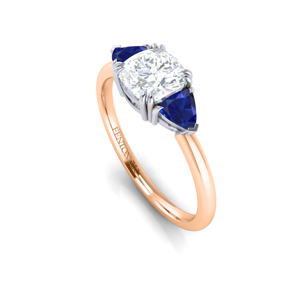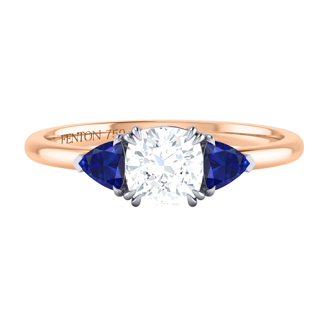 Lab Grown Solar Diamond Trilogy Cushion Cut Diamond and Blue Sapphire 18k Rose Gold Ring