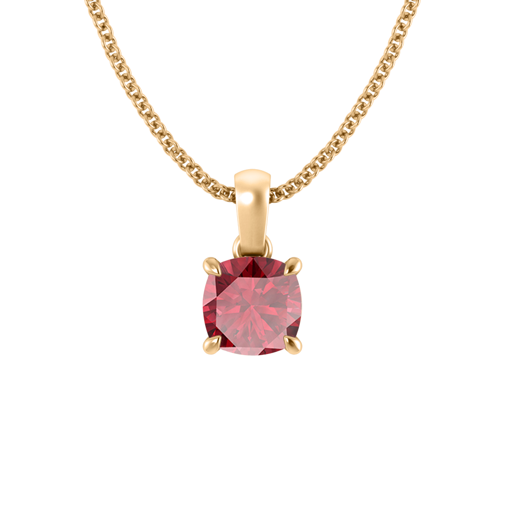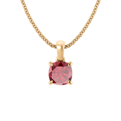 Le collier à pendentif Solitaire est un favori étincelant, combinant l'intemporalité avec une touche de couleur. Le pendentif Coussin cut Rubis se balance élégamment sur une chaîne solide et recyclée 18K Or Jaune mesurant 18 pouces et ajustable à une longueur plus courte de 16 pouces.