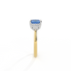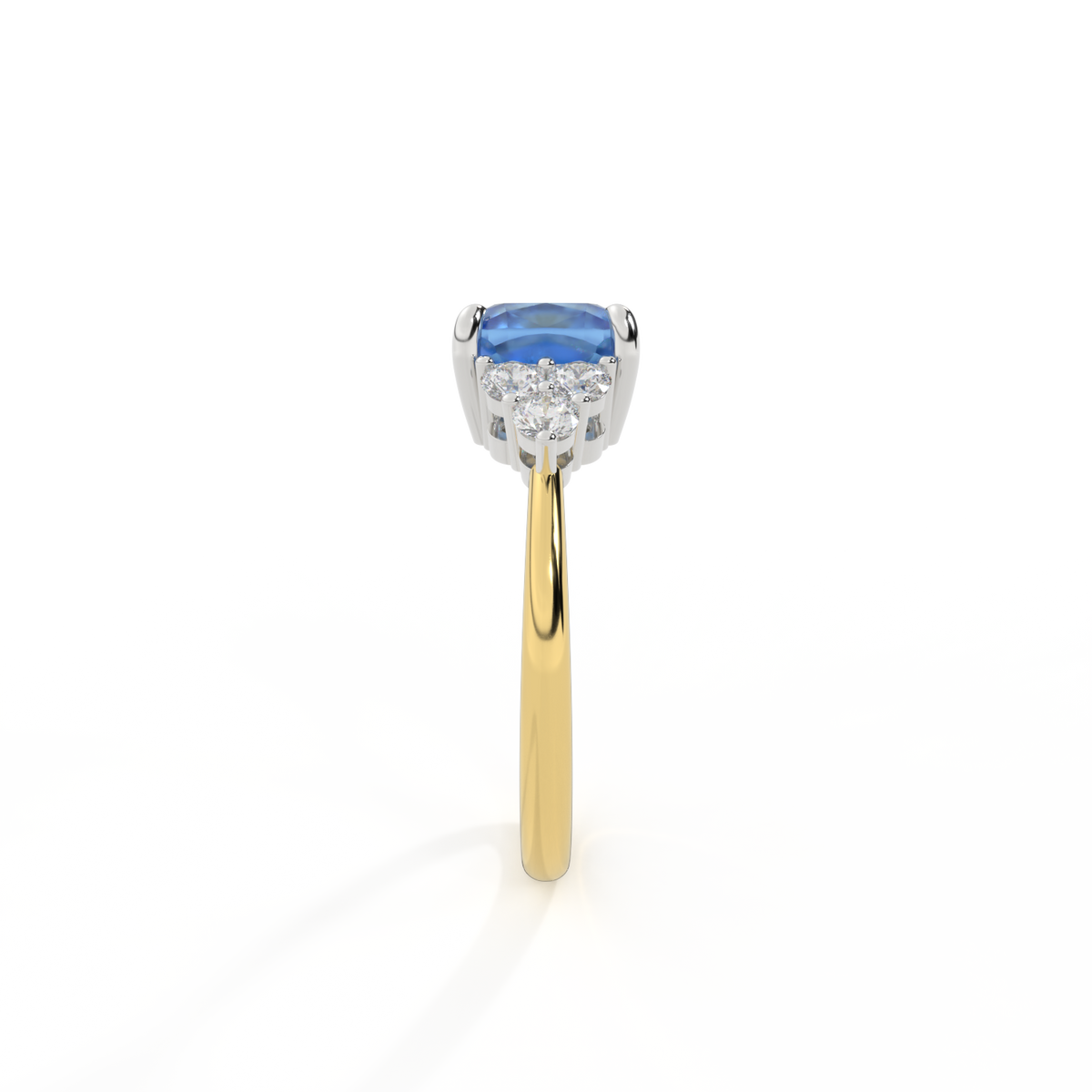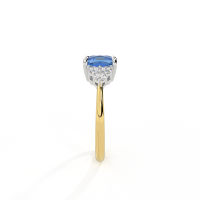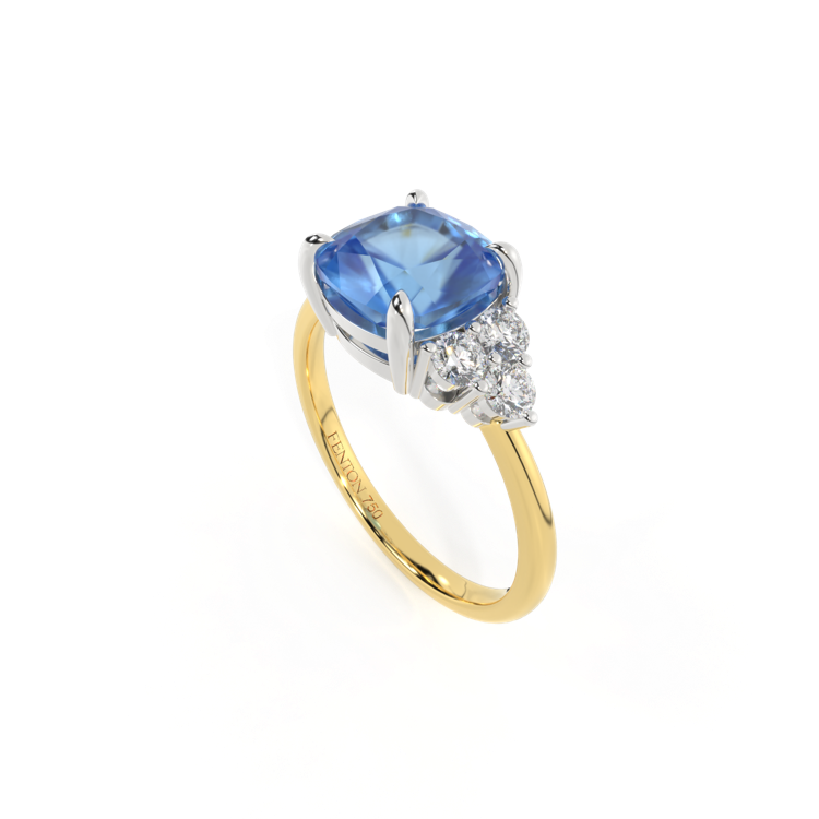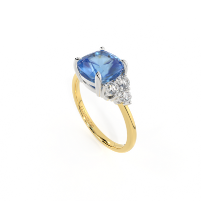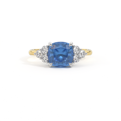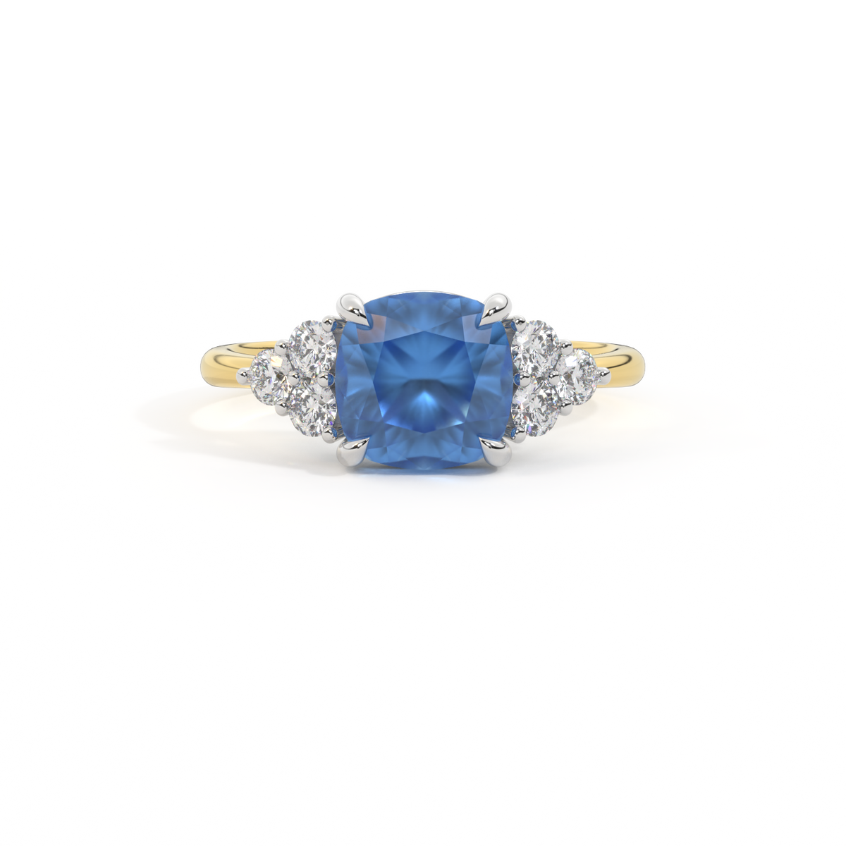 L'étincelante Coussin cut Saphir Bleu est encadrée de part et d'autre d'un trèfle composé de trois diamants ronds de taille brillant GH/VS de 1,8 mm, chacun étant solidement maintenu en place par une griffe. Le design attire l'attention sur la pierre centrale Saphir Bleu qui brille de mille feux, fièrement posée dans une monture classique à galerie ouverte, fabriquée en or 18K ou en platine recyclé. La monture ouverte de ce modèle permet à la lumière de se refléter dans toutes les directions, créant ainsi un aspect lustré et étincelant.