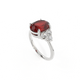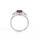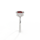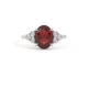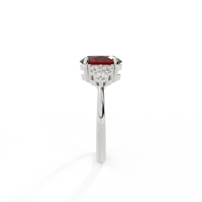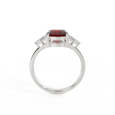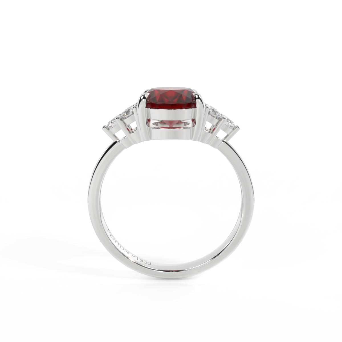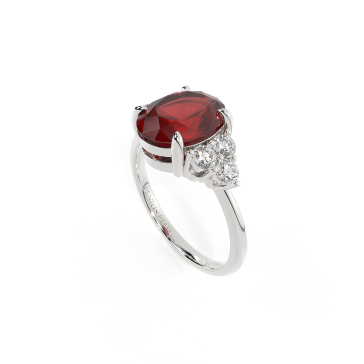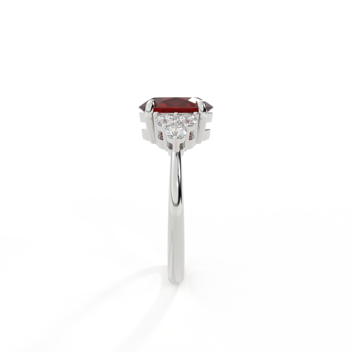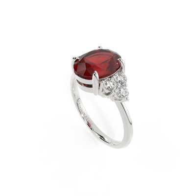 L'étincelante Ovale cut Grenat est encadrée de part et d'autre d'un trèfle composé de trois diamants ronds de taille brillant GH/VS de 1,8 mm, chacun étant solidement maintenu en place par une griffe. Le design attire l'attention sur la pierre centrale Grenat qui brille de mille feux, fièrement posée dans une monture classique à galerie ouverte, fabriquée en or 18K ou en platine recyclé. La monture ouverte de ce modèle permet à la lumière de se refléter dans toutes les directions, créant ainsi un aspect lustré et étincelant.