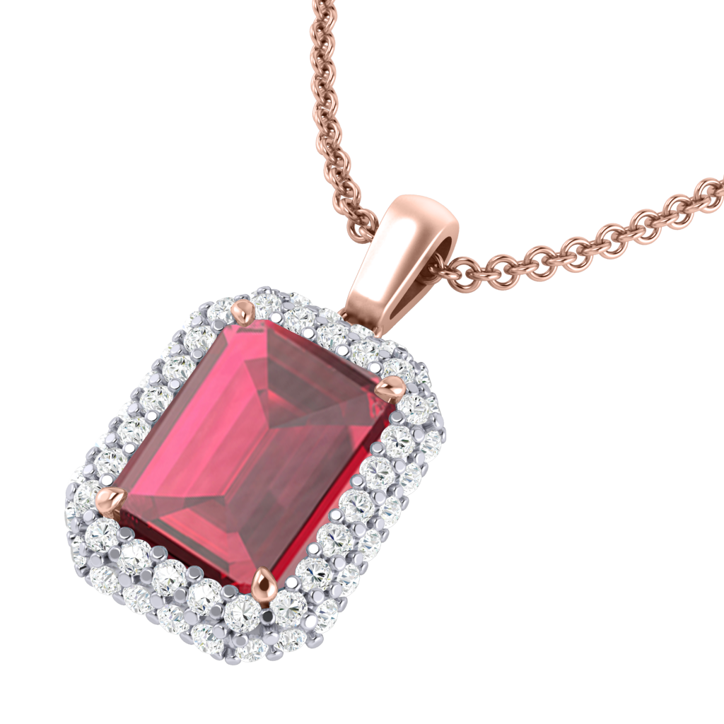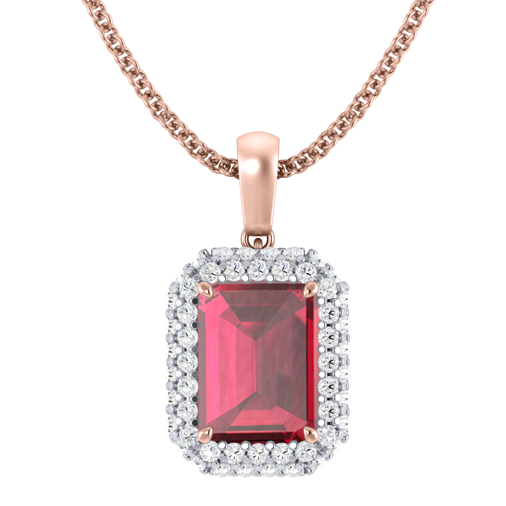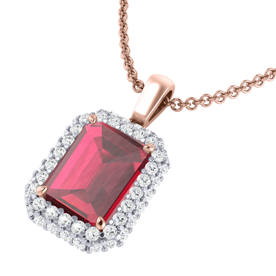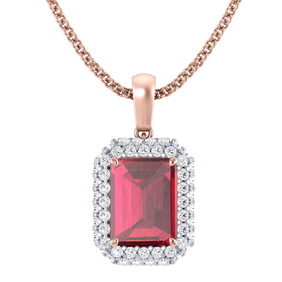 Portez votre Rubis près de votre cœur avec notre collier à pendentif Vintage. L'étincelant pédant Émeraude cut Rubis est encadré d'un double halo de diamants de couleur G/H et de pureté VS qui confèrent au collier son esthétique vintage très appréciée, inspirée des bijoux du XVIIIe siècle.