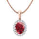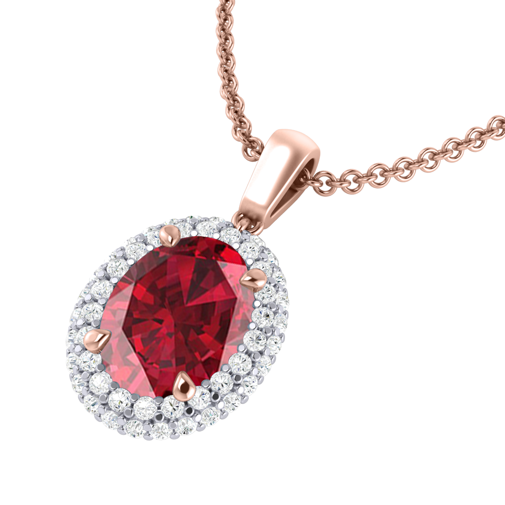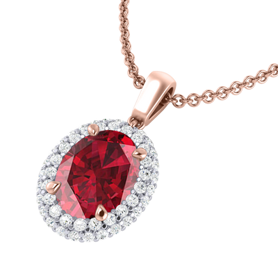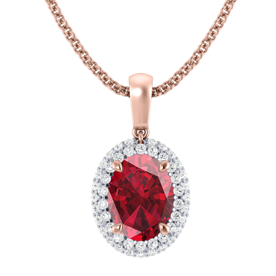 Portez votre Rubis près de votre cœur avec notre collier à pendentif Vintage. L'étincelant pédant Ovale cut Rubis est encadré d'un double halo de diamants de couleur G/H et de pureté VS qui confèrent au collier son esthétique vintage très appréciée, inspirée des bijoux du XVIIIe siècle.