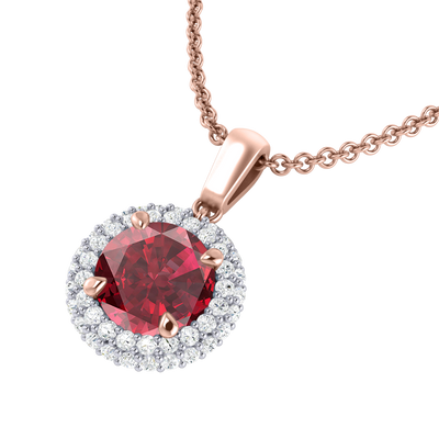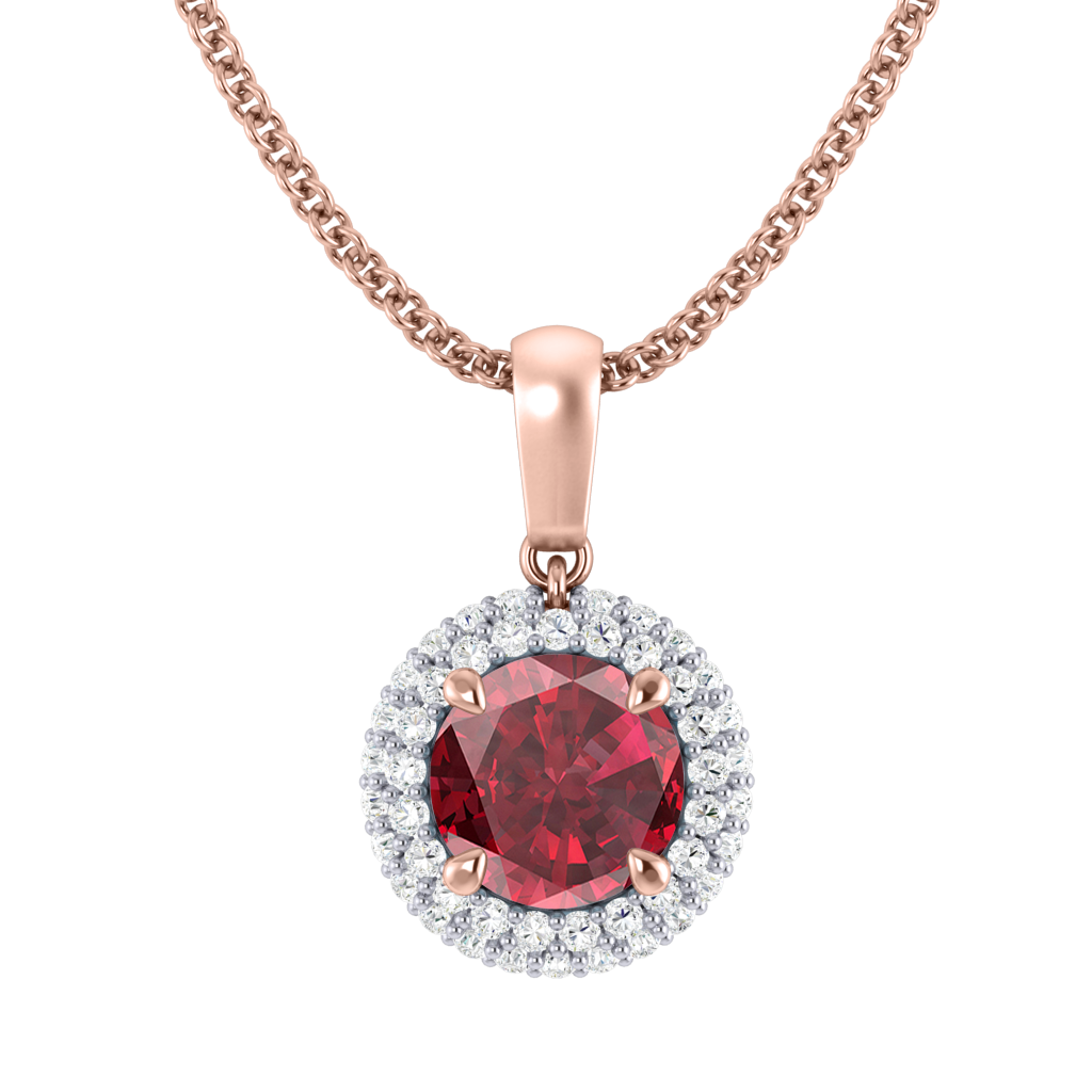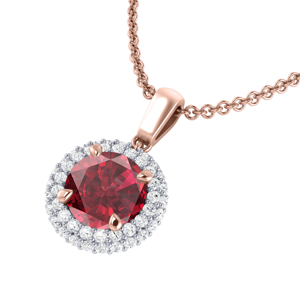 Portez votre Rubis près de votre cœur avec notre collier à pendentif Vintage. L'étincelant pédant Rond cut Rubis est encadré d'un double halo de diamants de couleur G/H et de pureté VS qui confèrent au collier son esthétique vintage très appréciée, inspirée des bijoux du XVIIIe siècle.