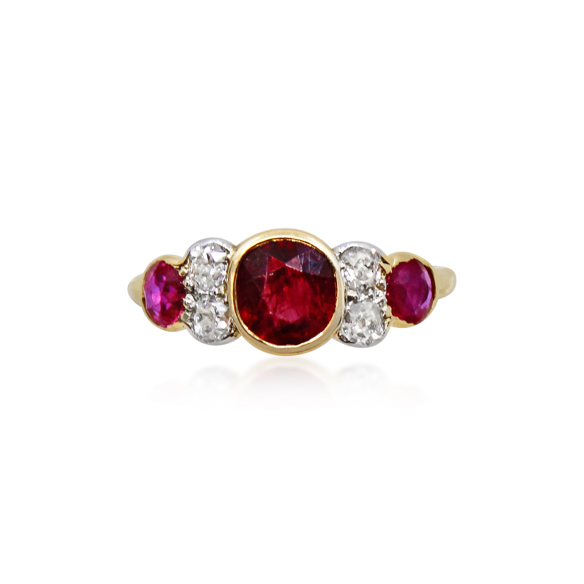 Vintage Three-Stone Ruby & Old Mine Cut Diamond Ring in 18K Yellow Gold