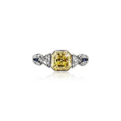 Vintage Asscher Cut Yellow Diamond, Blue Sapphire and Diamond Ring