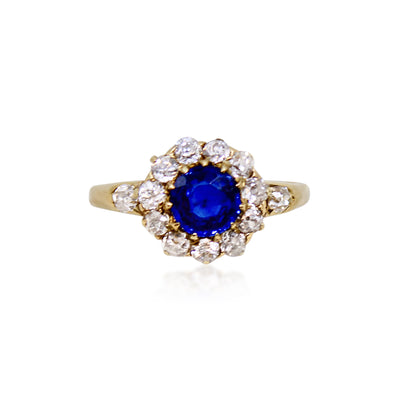 Antique Blue Sapphire and Old Mine cut Diamond Cluster Ring in 18K Yellow Gold