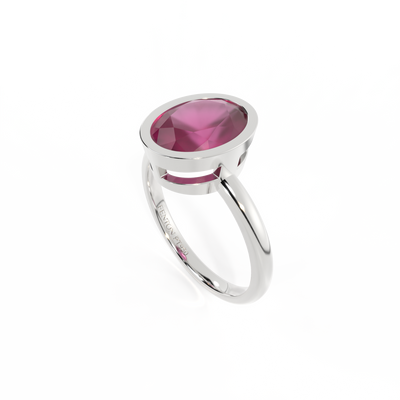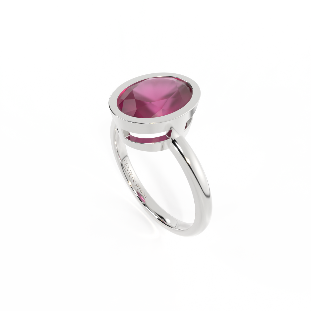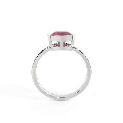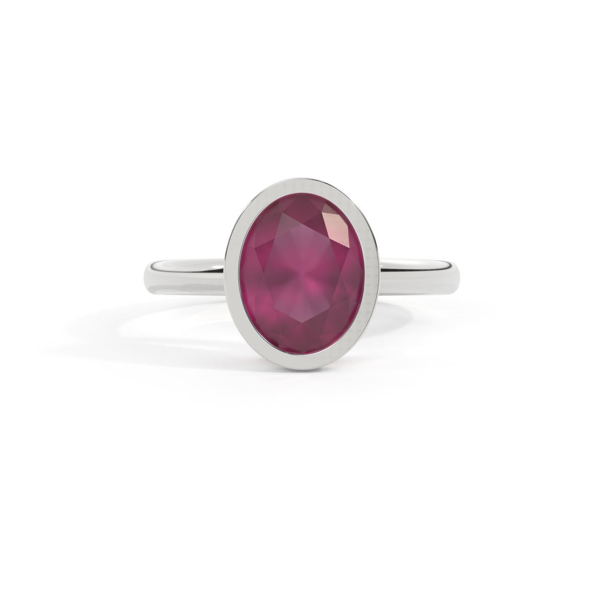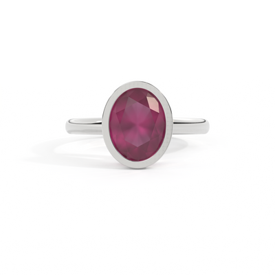 Minimalism meets modernism - the unique characteristics of this Oval cut Ruby are given centre stage in The Bezel. A modern take on a solitaire, this style frames the 6mm Ruby in a secure custom made setting that's simple and striking at the same time.
