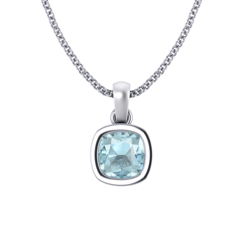 The Bezel Pendant Necklace combines minimalism with modern elegance. The Cushion cut Aquamarine pendant is bezel-set in a 18K White Gold rim and effortlessly balances on a matching chain.