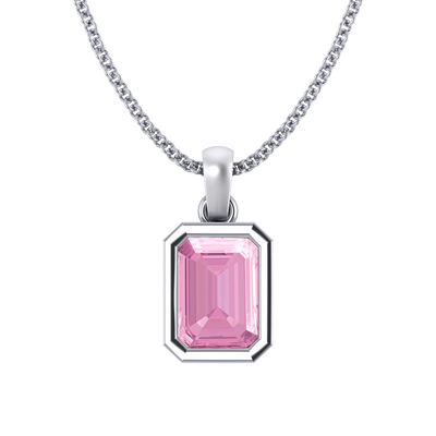 The Bezel Pendant Necklace combines minimalism with modern elegance. The Emerald cut Pink Sapphire pendant is bezel-set in a 18K White Gold rim and effortlessly balances on a matching chain.