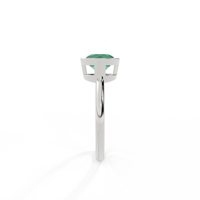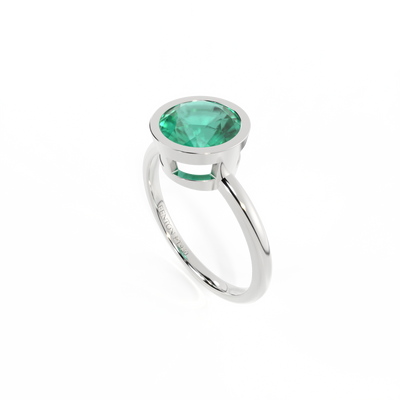 Minimalism meets modernism - the unique characteristics of this Round cut Emerald are given centre stage in The Bezel. A modern take on a solitaire, this style frames the 6mm Emerald in a secure custom made setting that's simple and striking at the same time.