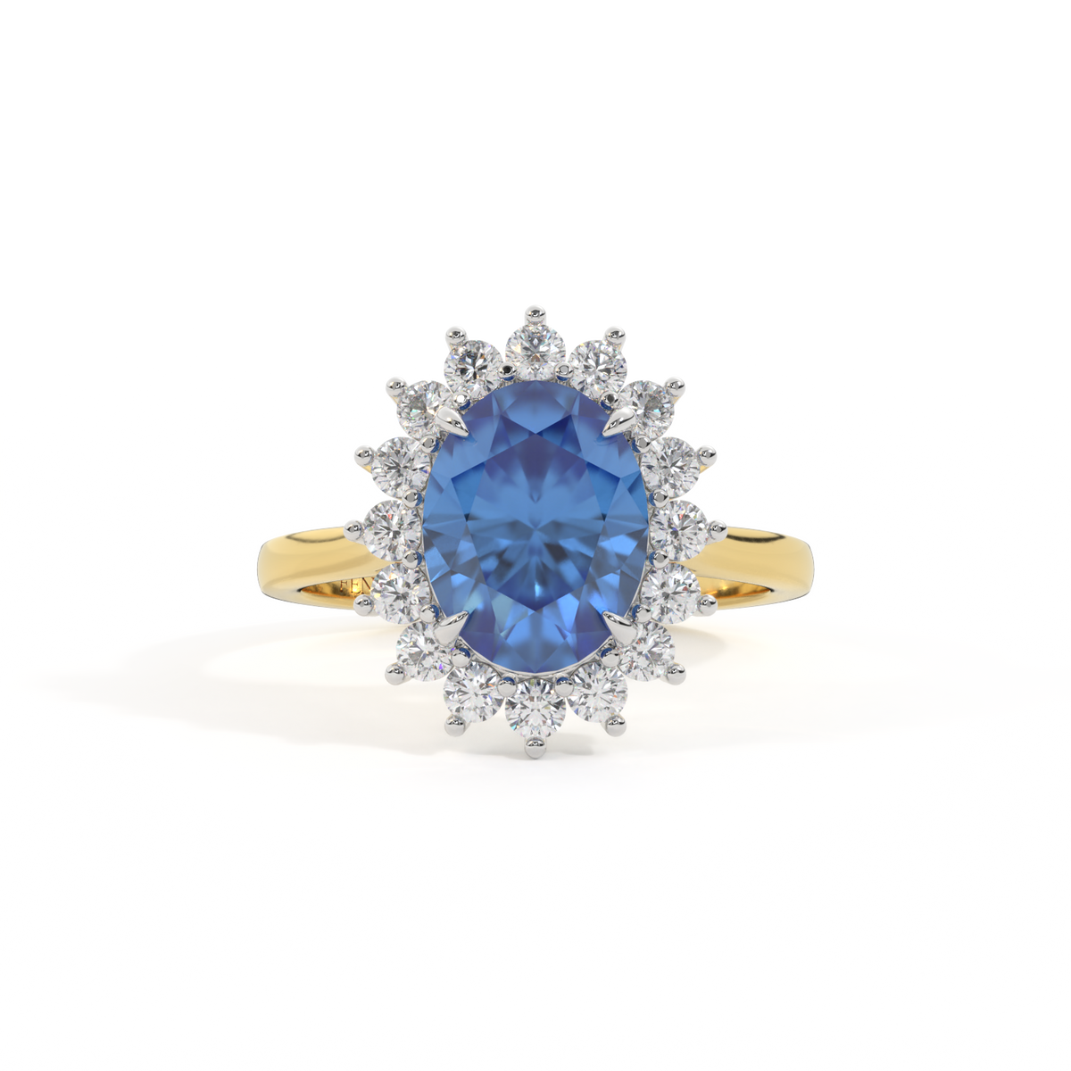 Make a majestic statement with The Star ring from Fenton. Inspired by the celestial beauty of the night sky, this classic design features an impactful colourful centre gemstone, surrounded by a halo of diamonds which are G to H colour and VS clarity. The outer three claw setting is what gives this design the sparkling ‘star’ aesthetic making it a real showstopper.