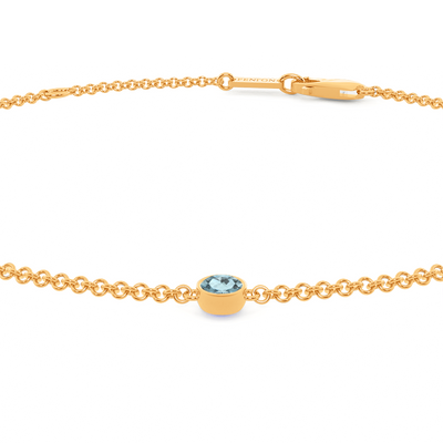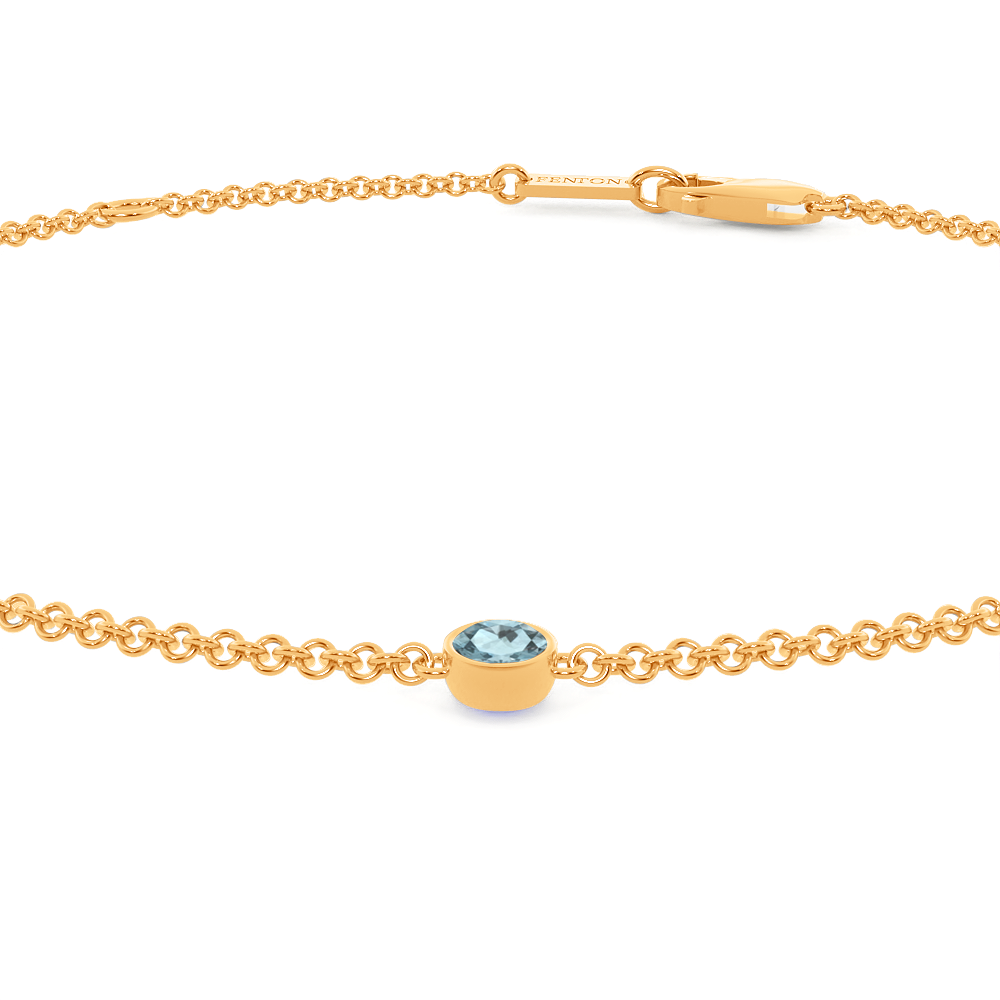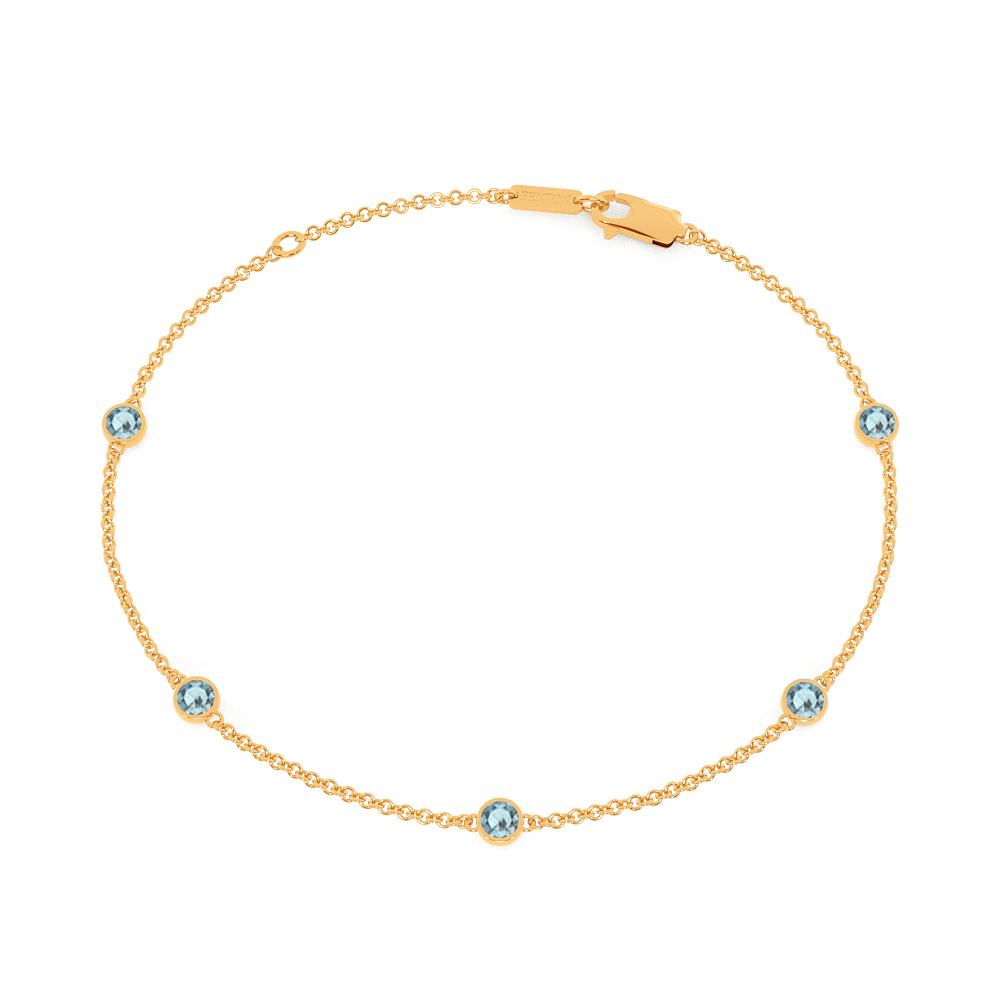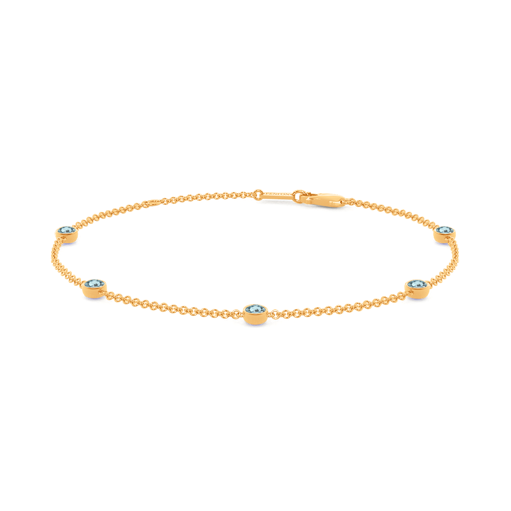 Our Five Stone Bezel Aquamarine Bracelet brings out the beauty in minimalist elegance. The classic 18K Yellow Gold chain carries five glistening 3mm round-cut Aquamarine stones each secured in a modern bezel setting that create a perfect everyday bracelet style and effortless, sparkling statement on your wrist.