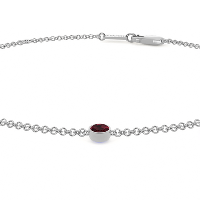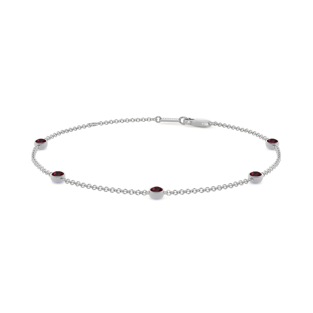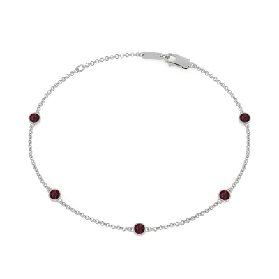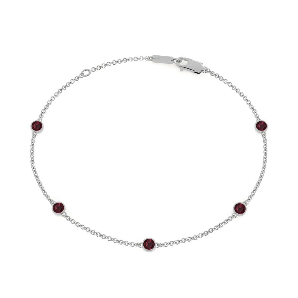 Our Five Stone Bezel Garnet Bracelet brings out the beauty in minimalist elegance. The classic 18K White Gold chain carries five glistening 3mm round-cut Garnet stones each secured in a modern bezel setting that create a perfect everyday bracelet style and effortless, sparkling statement on your wrist.