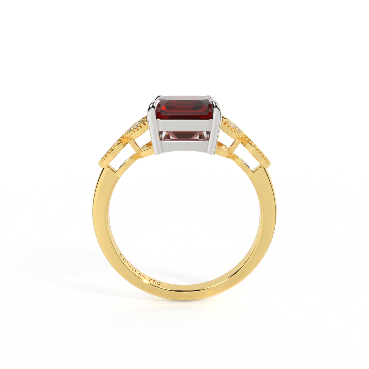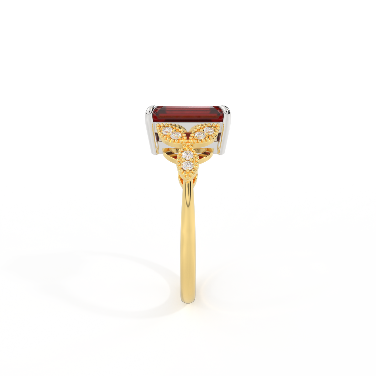 The beauty of a flower, re-imagined for eternity. Inspired by the romance of the Victorian era, this Emerald cut Garnet is accentuated by a duo of delicate diamond-set petals with millegrain detail for an elegant twist on a timeless classic.