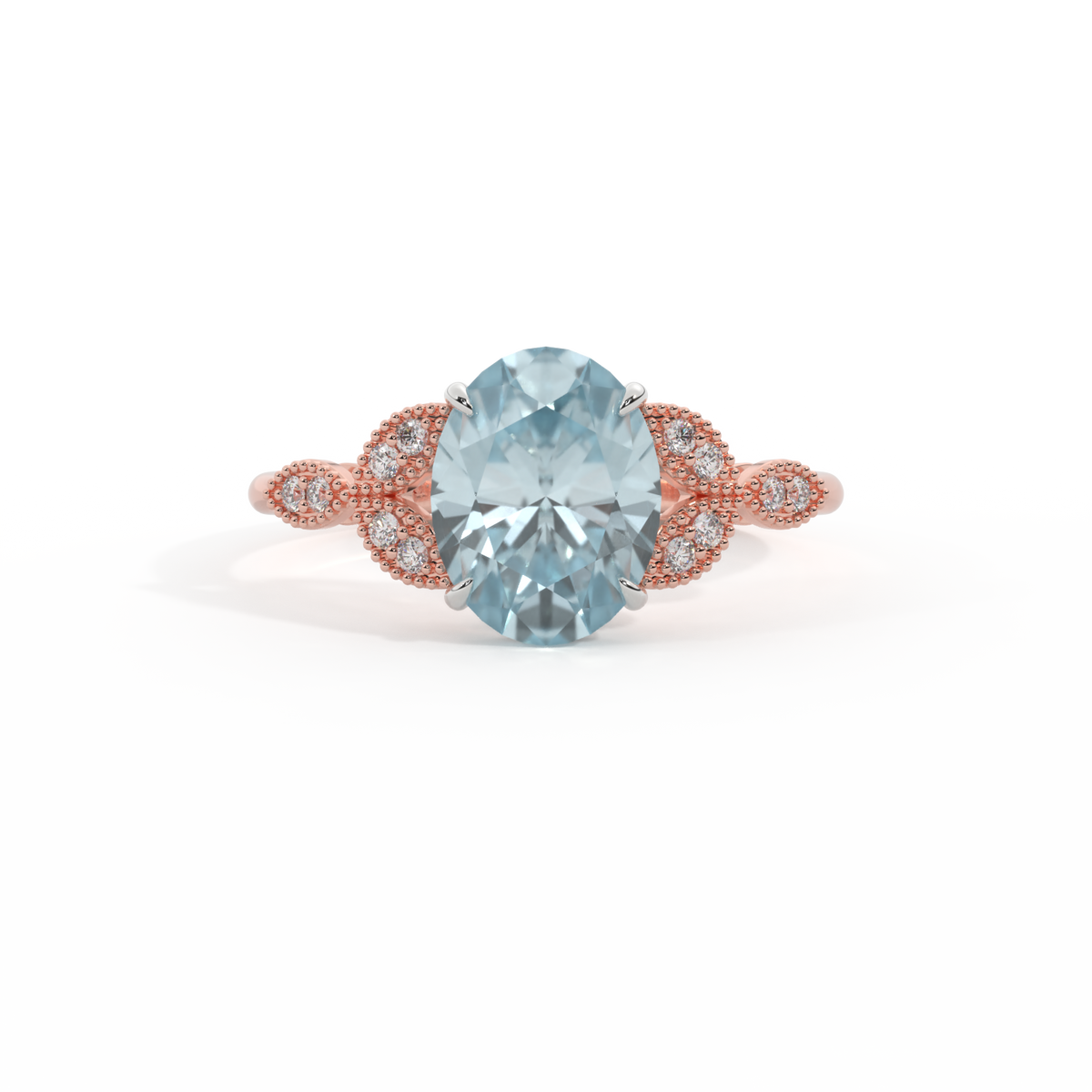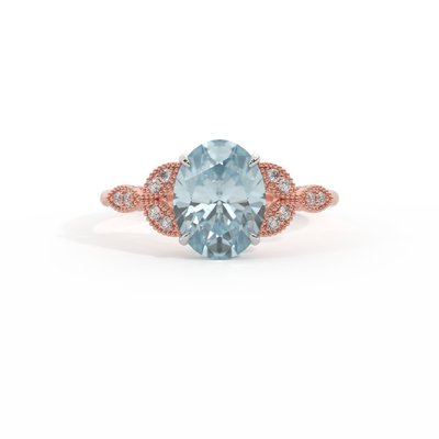The beauty of a flower, re-imagined for eternity. Inspired by the romance of the Victorian era, this Oval cut Aquamarine is accentuated by a duo of delicate diamond-set petals with millegrain detail for an elegant twist on a timeless classic.