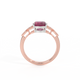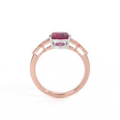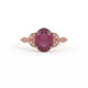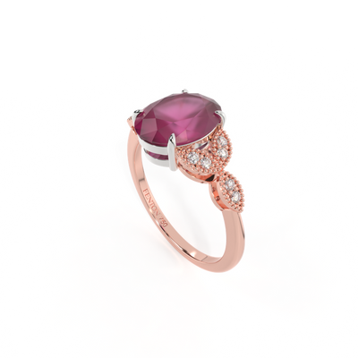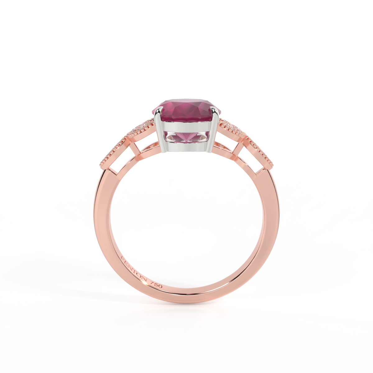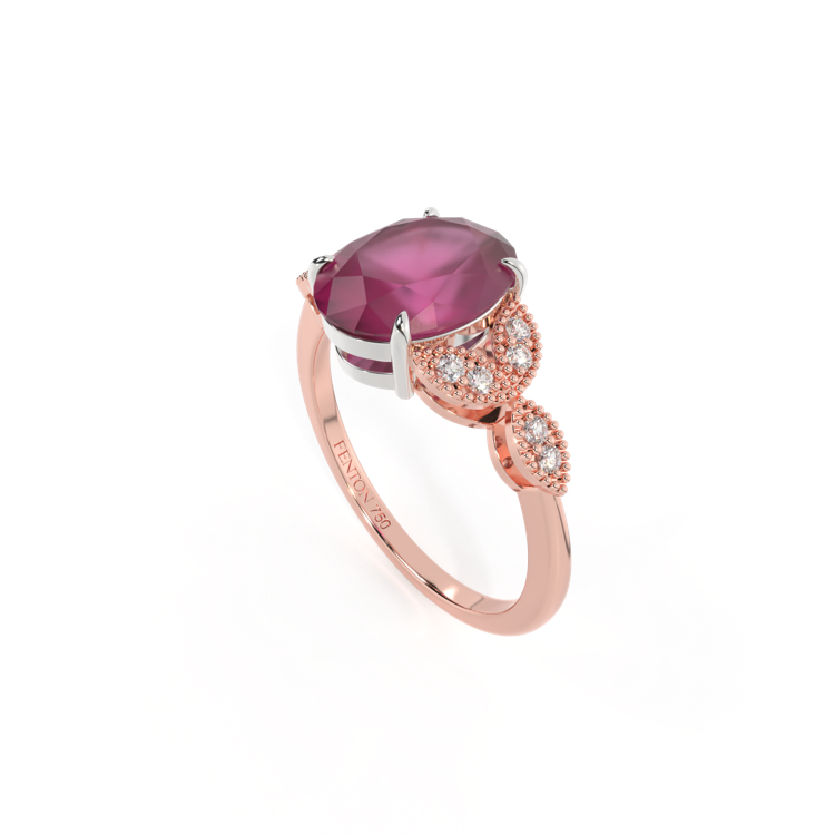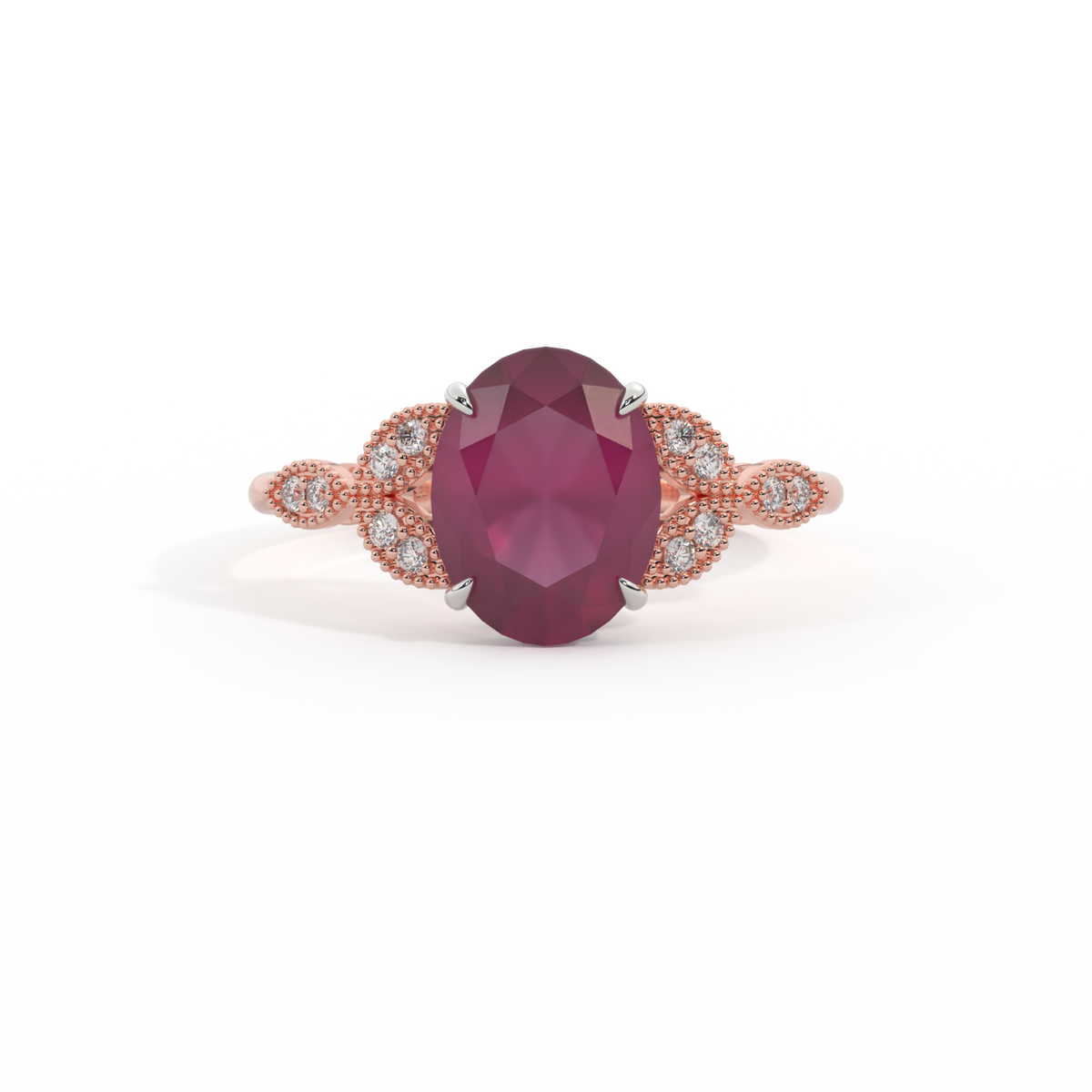 The beauty of a flower, re-imagined for eternity. Inspired by the romance of the Victorian era, this Oval cut Ruby is accentuated by a duo of delicate diamond-set petals with millegrain detail for an elegant twist on a timeless classic.